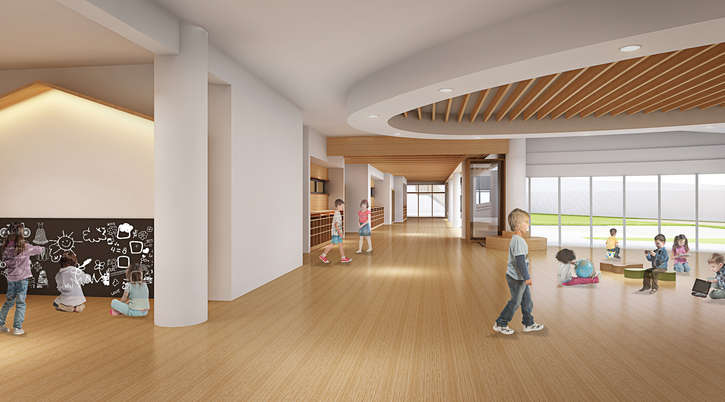The classroom and activity space of the kindergarten need natural ventilation and air flow. The classroom and corridor should have high window as possible. The corridor and balcony outside not only shade the sun, but also promote the flow of the wind. There should be air flow across the skin and visual scenery. Good natural landscape is helpful for children’s visual health and mental happiness.