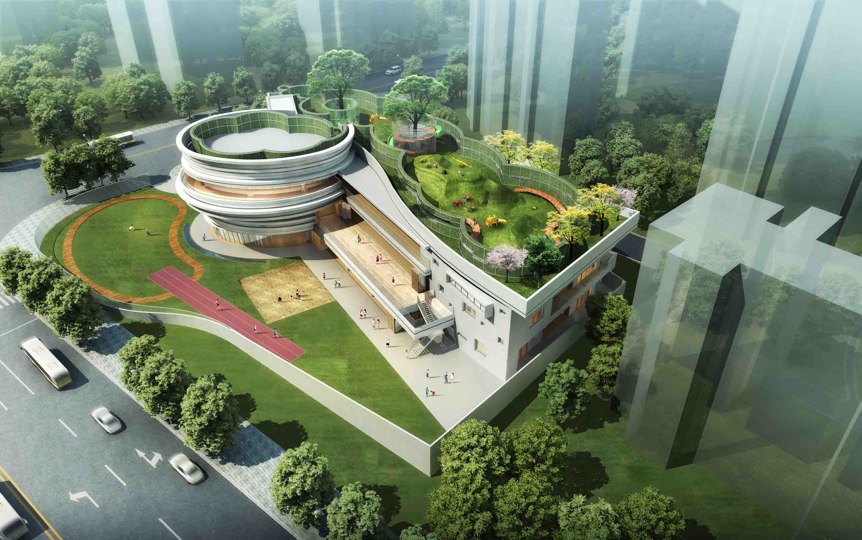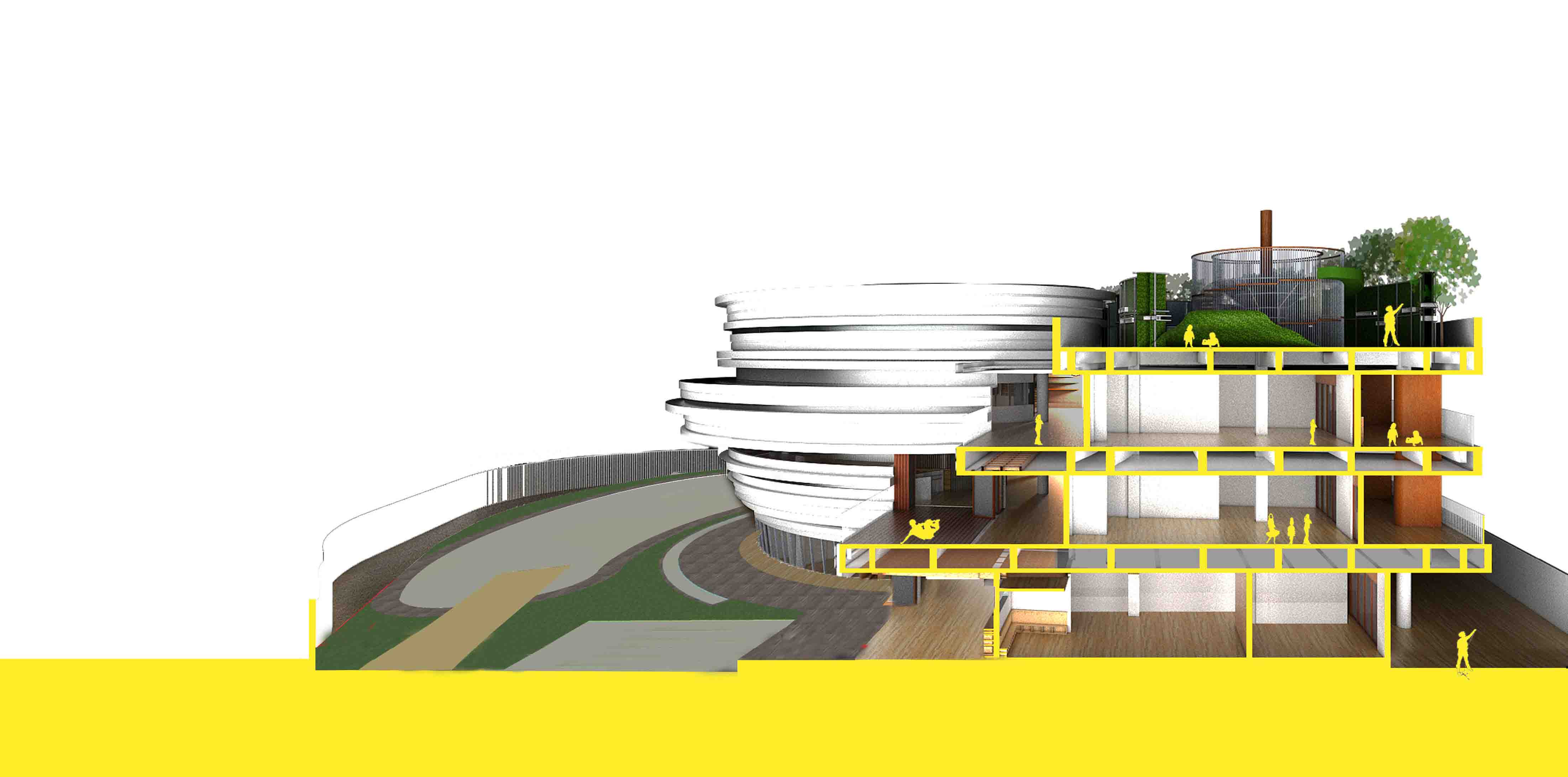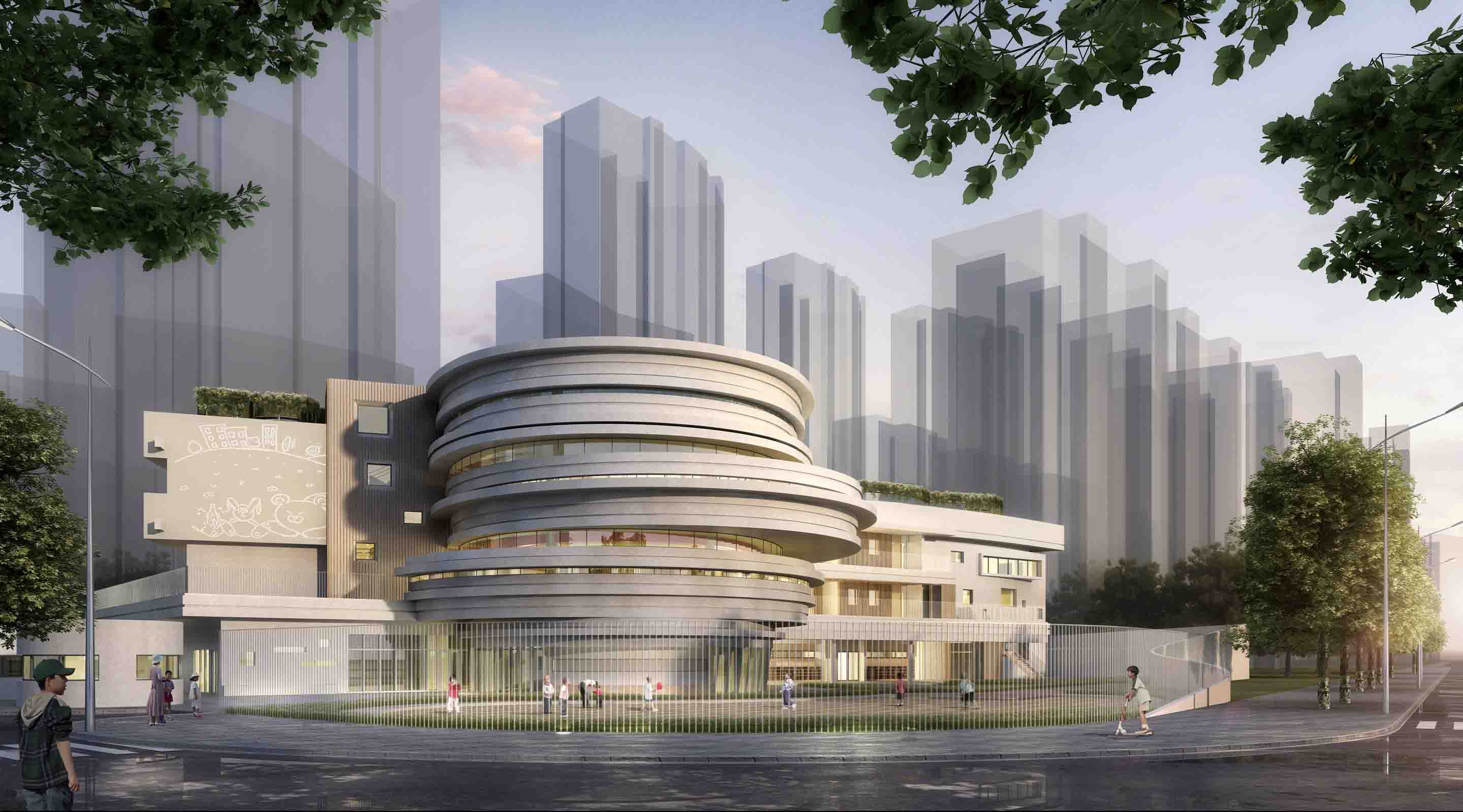 On the basis of the original building framework, the kindergarten cantilevers the entrance circular space to each direction with ellipses as units. The children are brought to the second floor through the ramp inside the space, and the circular circulation is formed through the cantilevered elliptical corridor. At the same time, the belt window is open on the circular circulation, bringing the forest in the century park into the circular space. The north and south directions of the activity room are given way to form a semi-outdoor activity platform, and a more complete circular circulation is formed with the elliptical ring corridor, so that the children can run and play without restriction. The prominent platform introduces the green landscape of the outdoor century park into the kindergarten space, and also blurs the internal and external space. On the other hand, the backstage also effectively blocks the direct light and forms air circulation, creating a more comfortable and natural space for children.