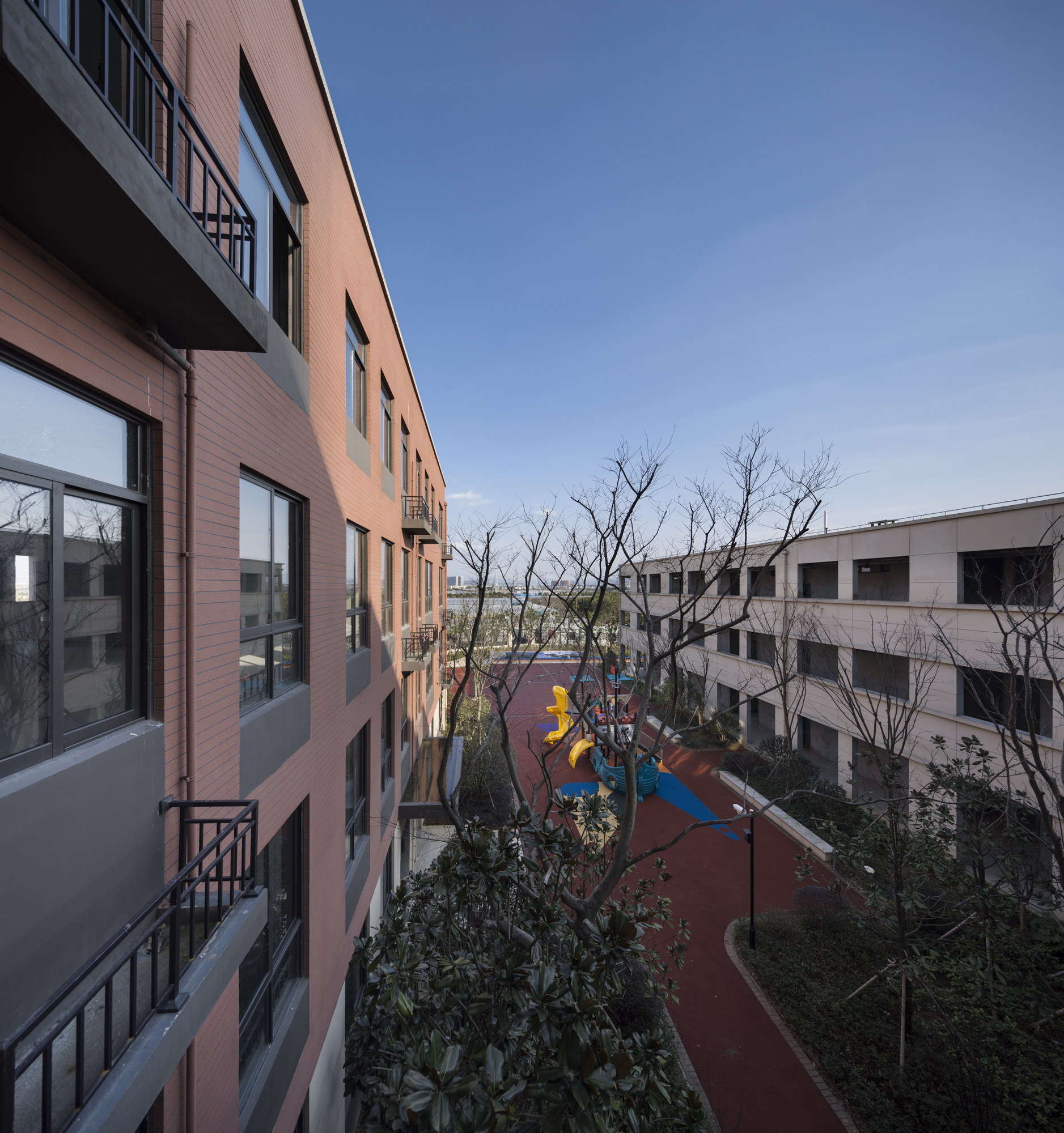 The activity site is placed in the northwest of the axis, forming an interaction and echo with the community landscape, and at the same time as a transition between the community and the school. The northeast of the axis faces the secondary road of the city, which is relatively quiet and safe for the kindergarten land, and the south site is for the primary school land. The activity land is enclosed by the teaching building and the community, forming a space similar to the courtyard. Facing the urban courtyard, it has introversion and openness, and facing its own courtyard, it has interaction and freedom.