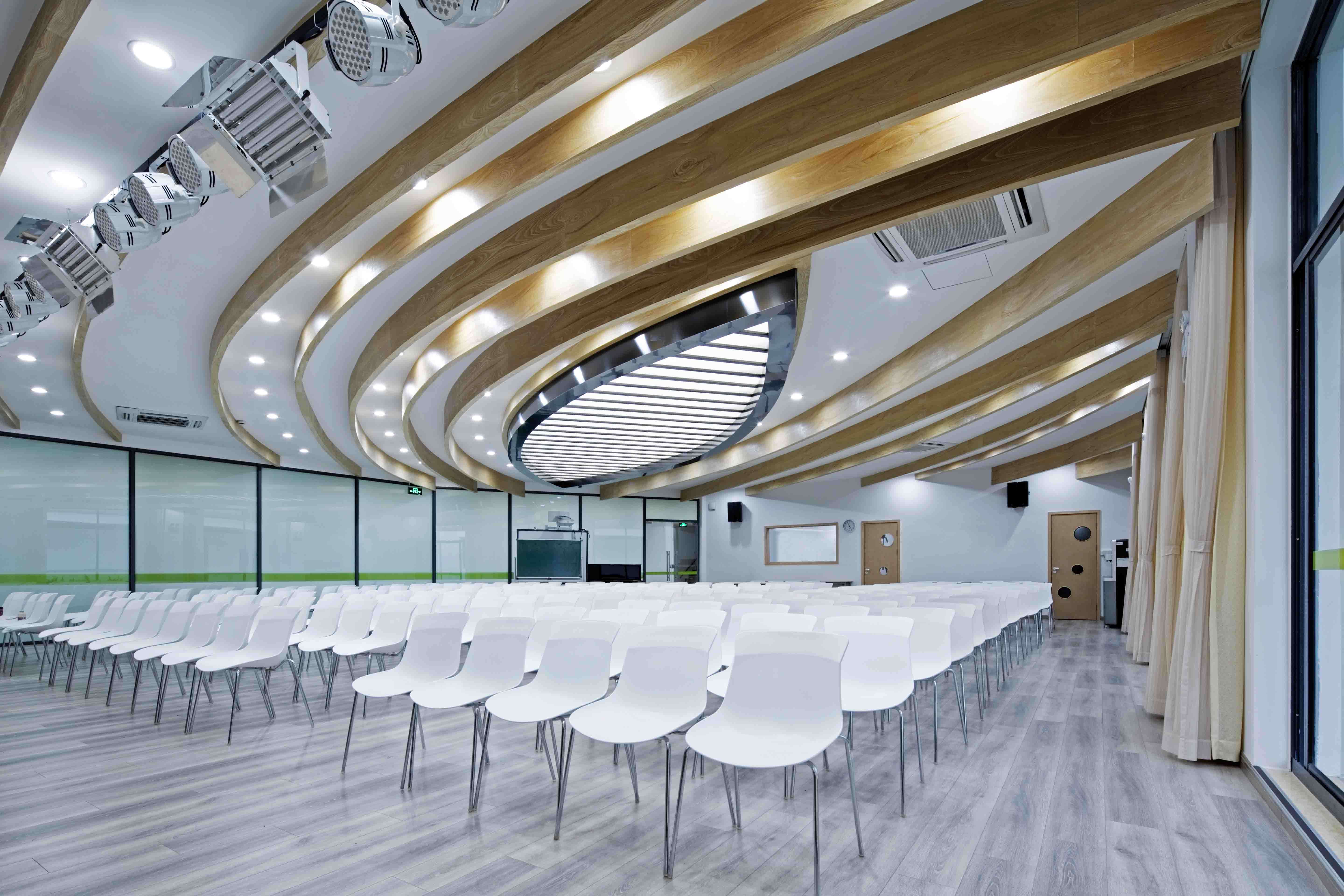 Another flexible space behind the stage of the multi-purpose hall perpendicular to the foyer can display the works of children, or it can be directly connected to the outside and through the passageway between the multi-purpose and the main building, it can be circled back to the origin, and clockwise it can be circled back to the foyer. The newly developed three winding and intersecting moving lines drive the vitality and connection of the space in the park, making the tension and interaction between the space and the space no longer estranged from each other.