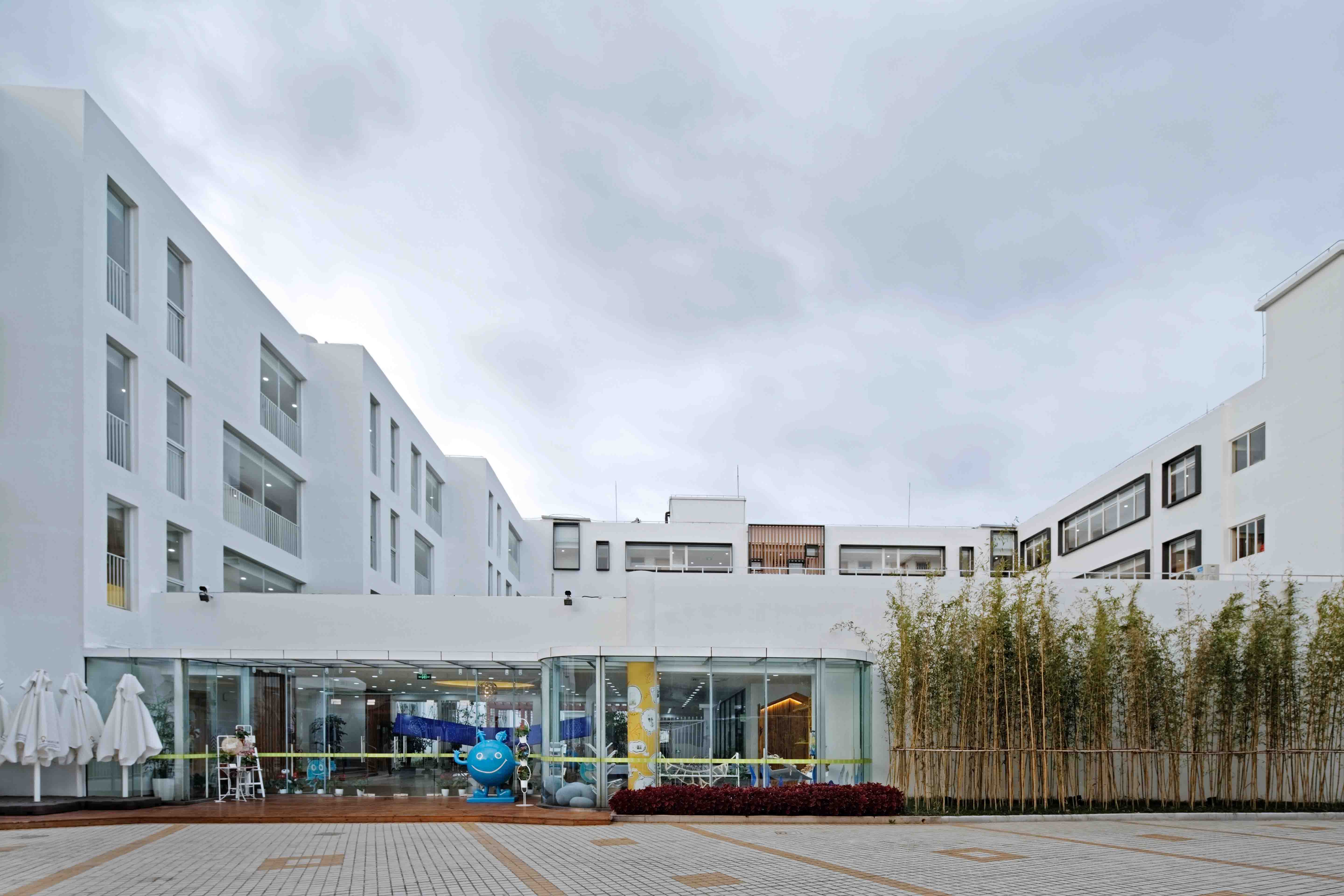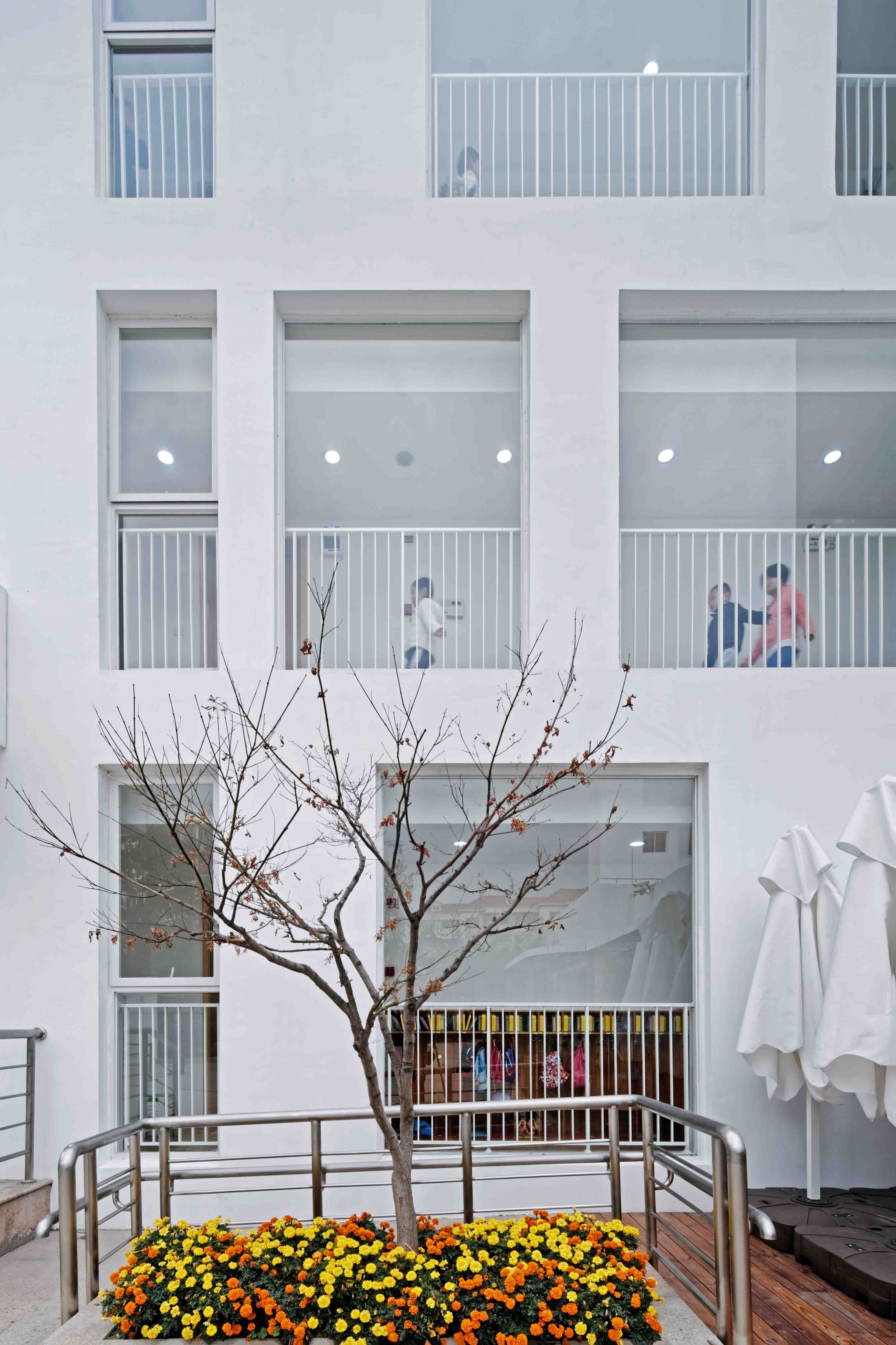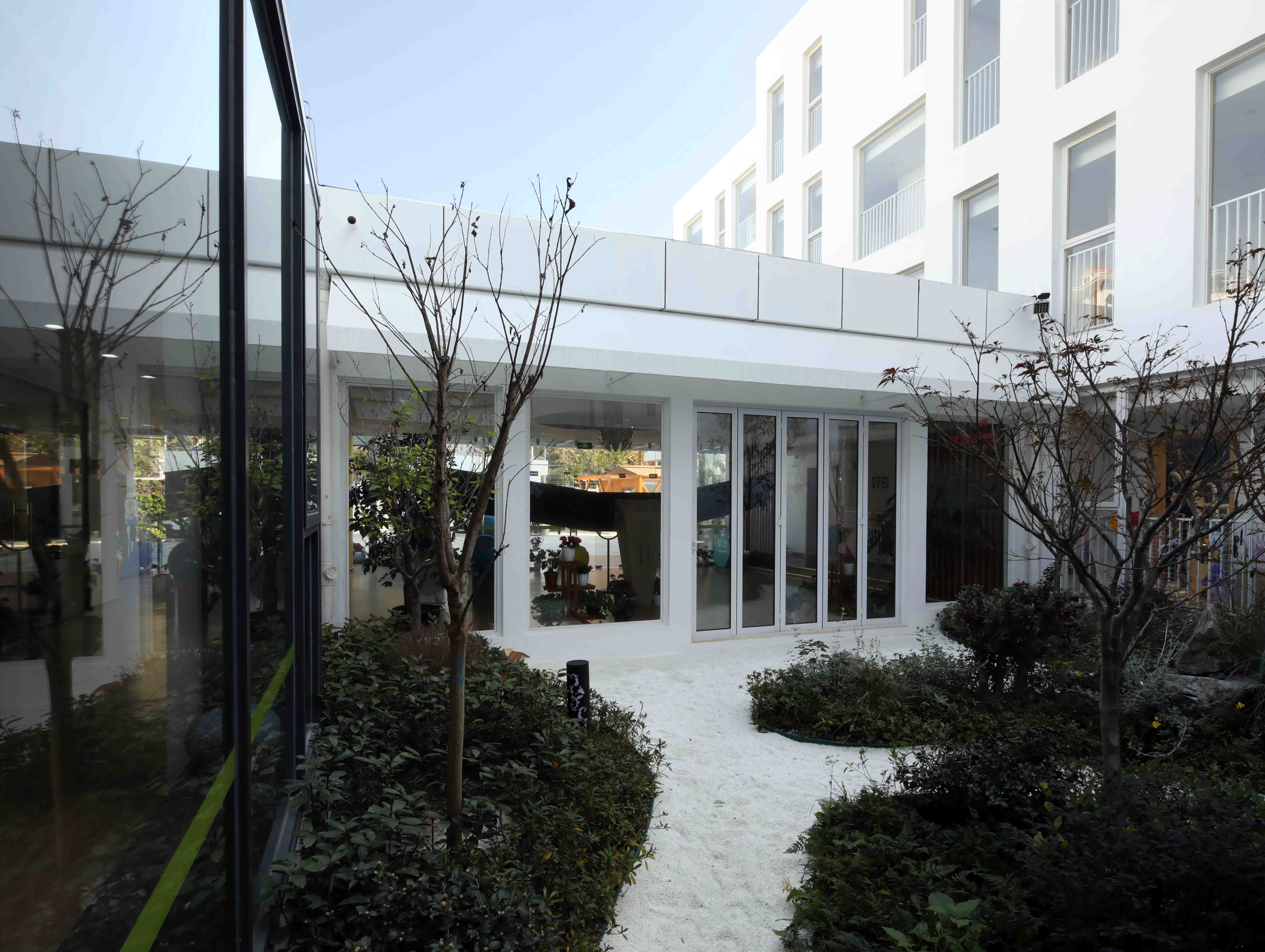 The unnecessary lines and corners and decorations of the building were stripped away, and the overall tone of the building was white. The uneven large area of floor-to-ceiling Windows liberate the narrow and turning corridor, and the children passing through the corridor have a more distinctive personality, and have a visual dialogue with the ground space and people. The differentiated behavior of moving between layers is clearer, more dramatic and more independent.