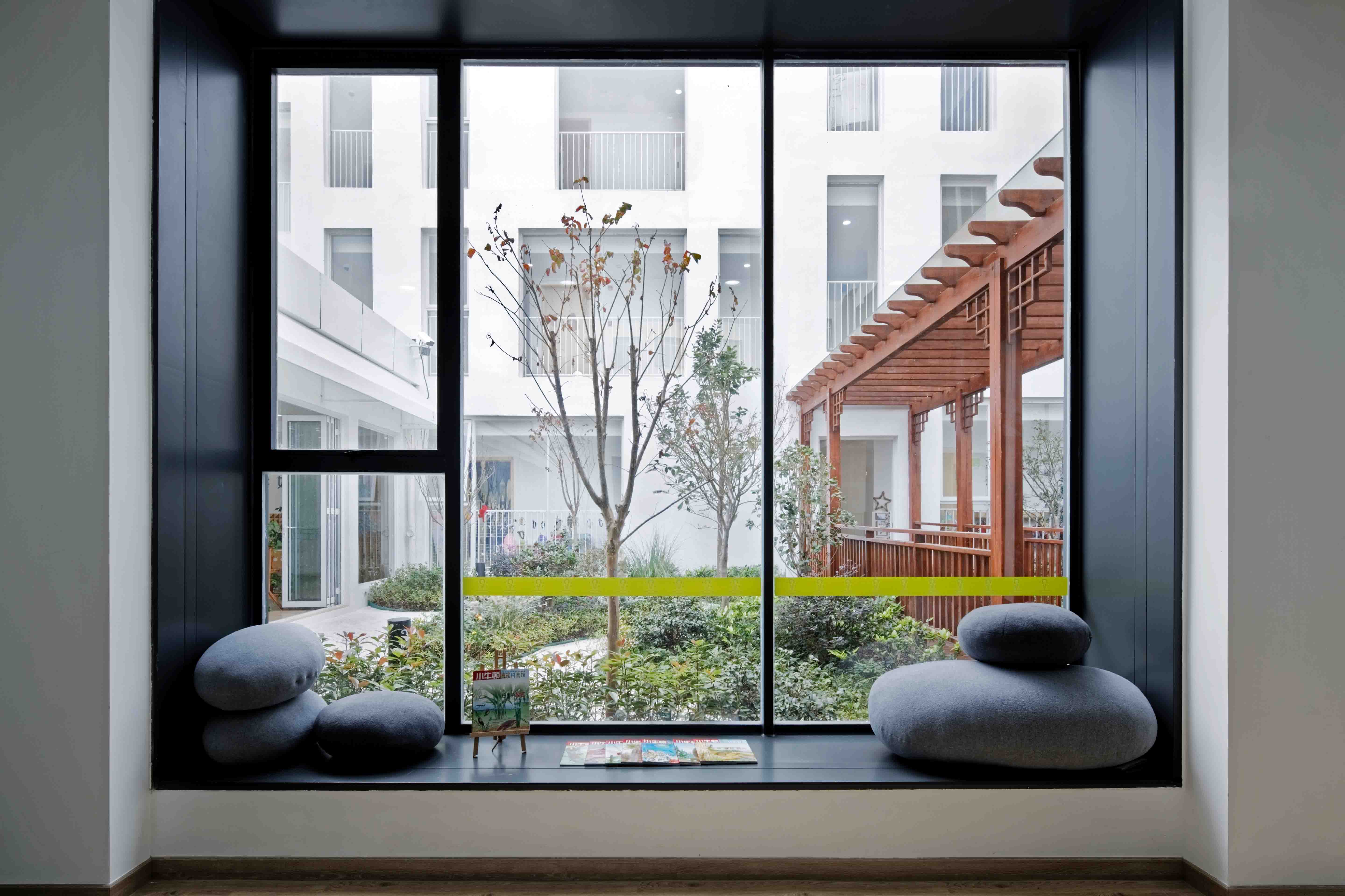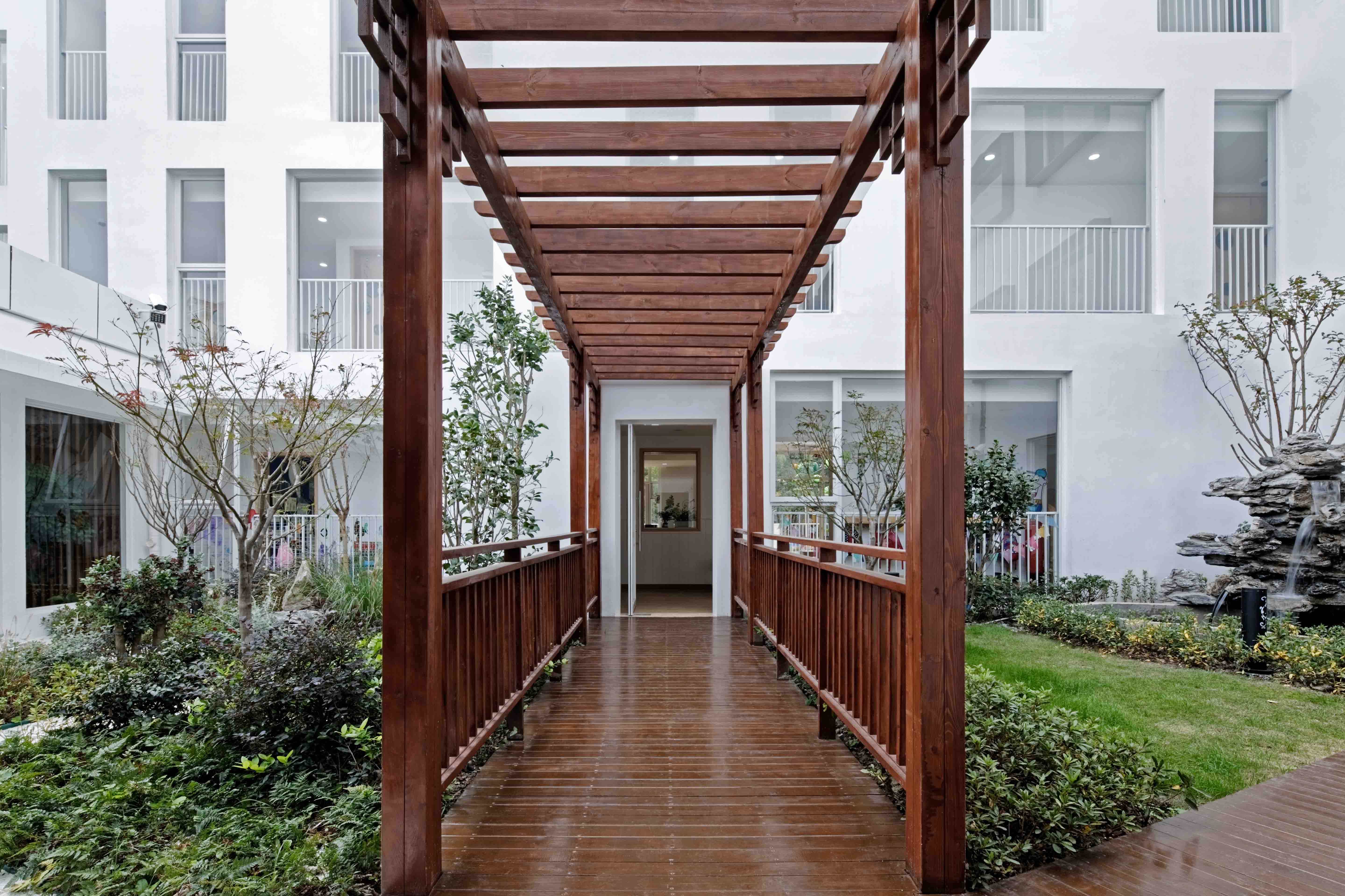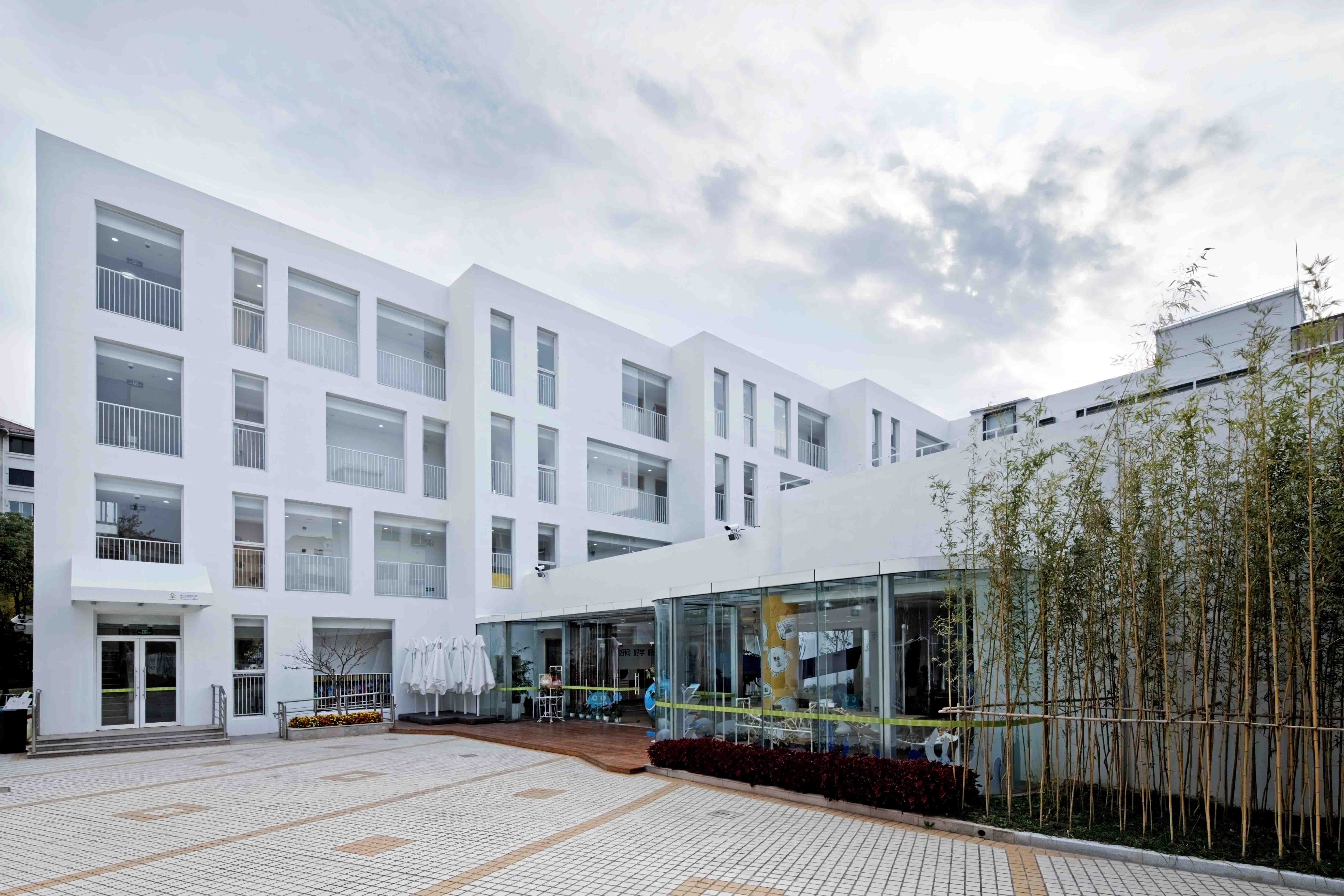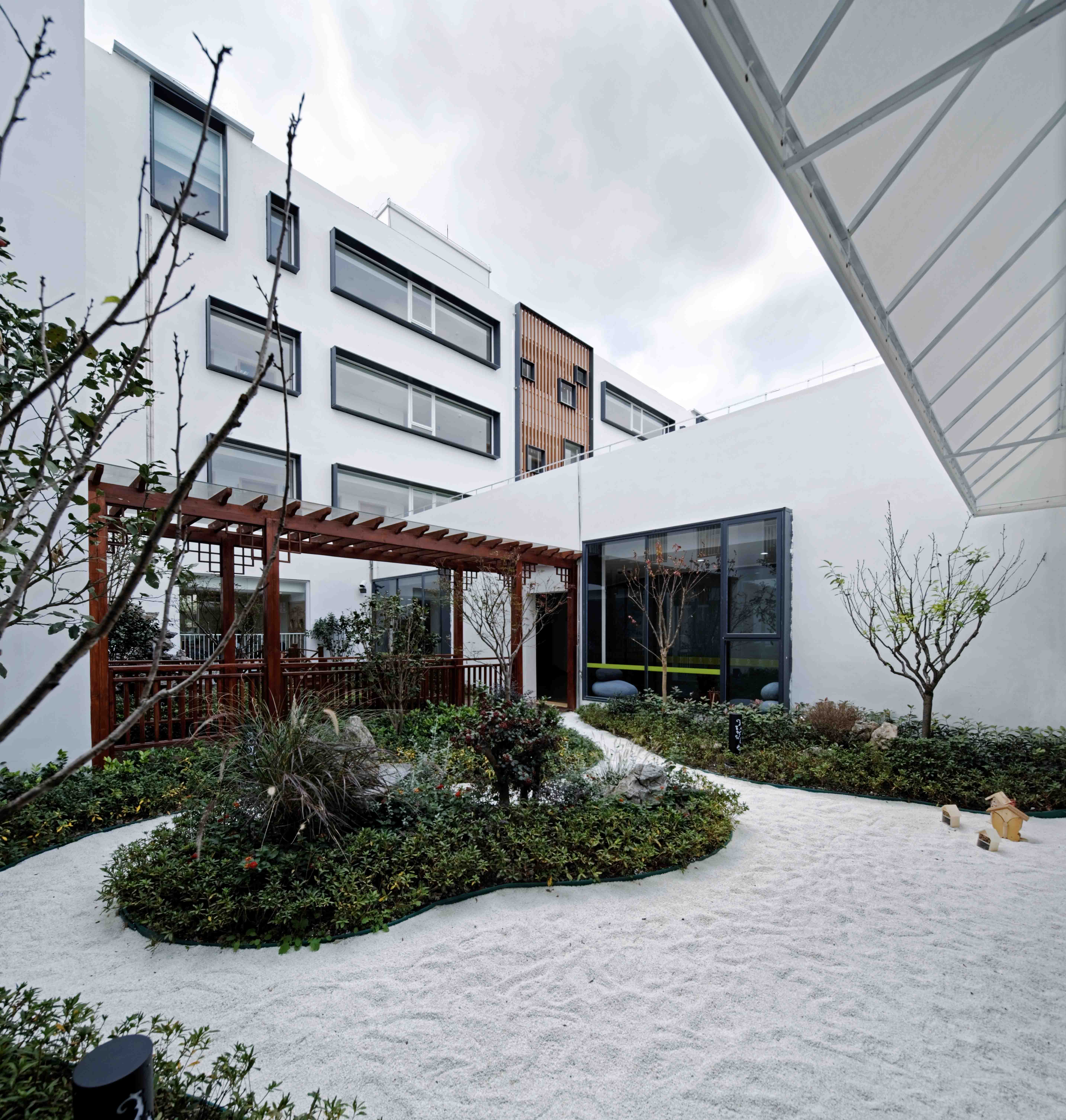 The unnecessary lines and corners and decorations of the building were stripped away, and the overall tone of the building was white. The uneven large area of floor-to-ceiling Windows liberate the narrow and turning corridor, and the children passing through the corridor have a more distinctive personality, and have a visual dialogue with the ground space and people. The differentiated behavior of moving between layers is clearer, more dramatic and more independent.