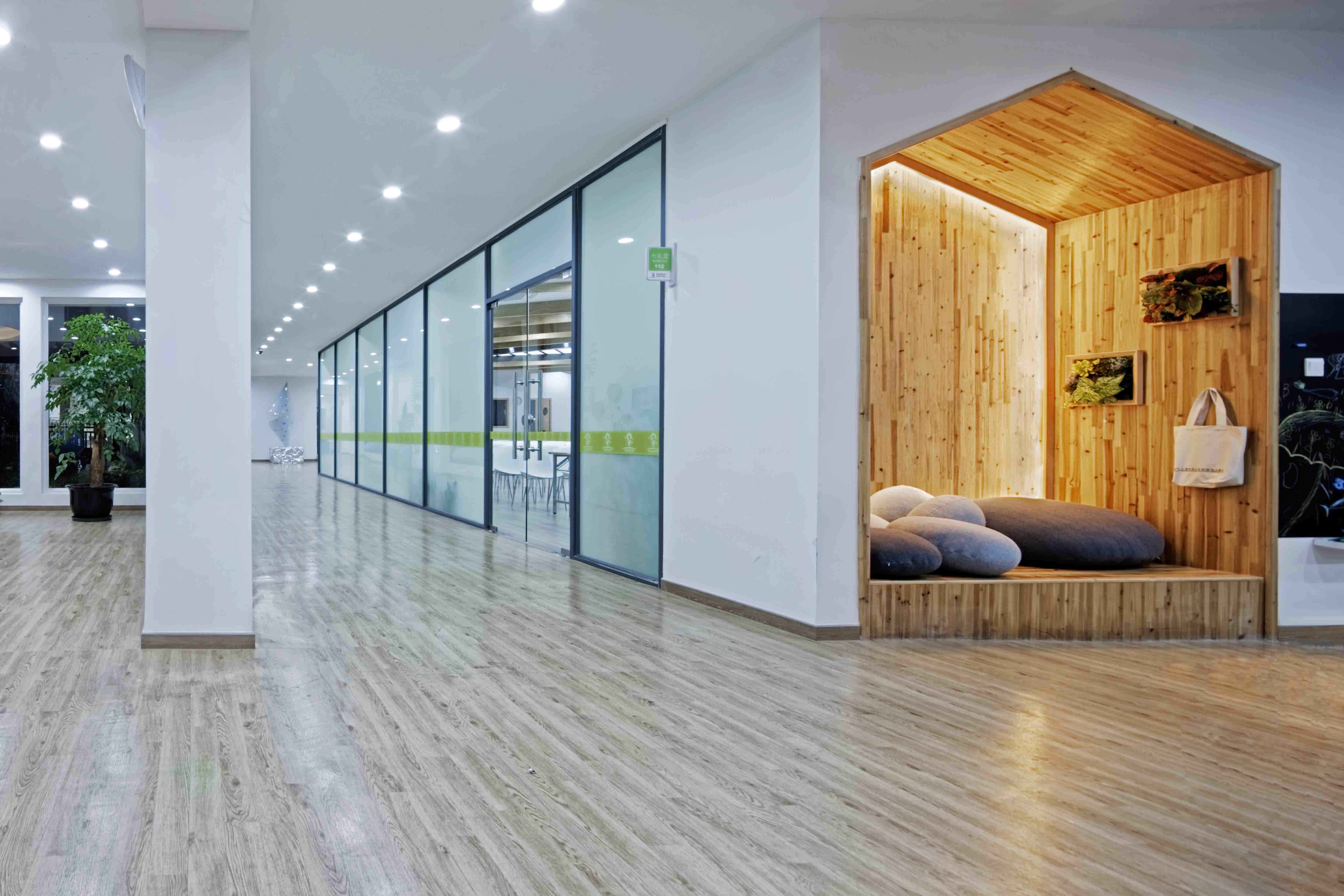 The three classrooms and the active line enclosed inner courtyard adjacent to the multi-function hall connect the surrounding Spaces that may participate through open and transparent floor-to-ceiling glass doors and Windows, stimulating the vitality of each space. The greening of the inner courtyard can be directly connected with the greening landscape in the south through the classroom, and the closer relationship between the interior and the outside seems to make the classroom in nature.