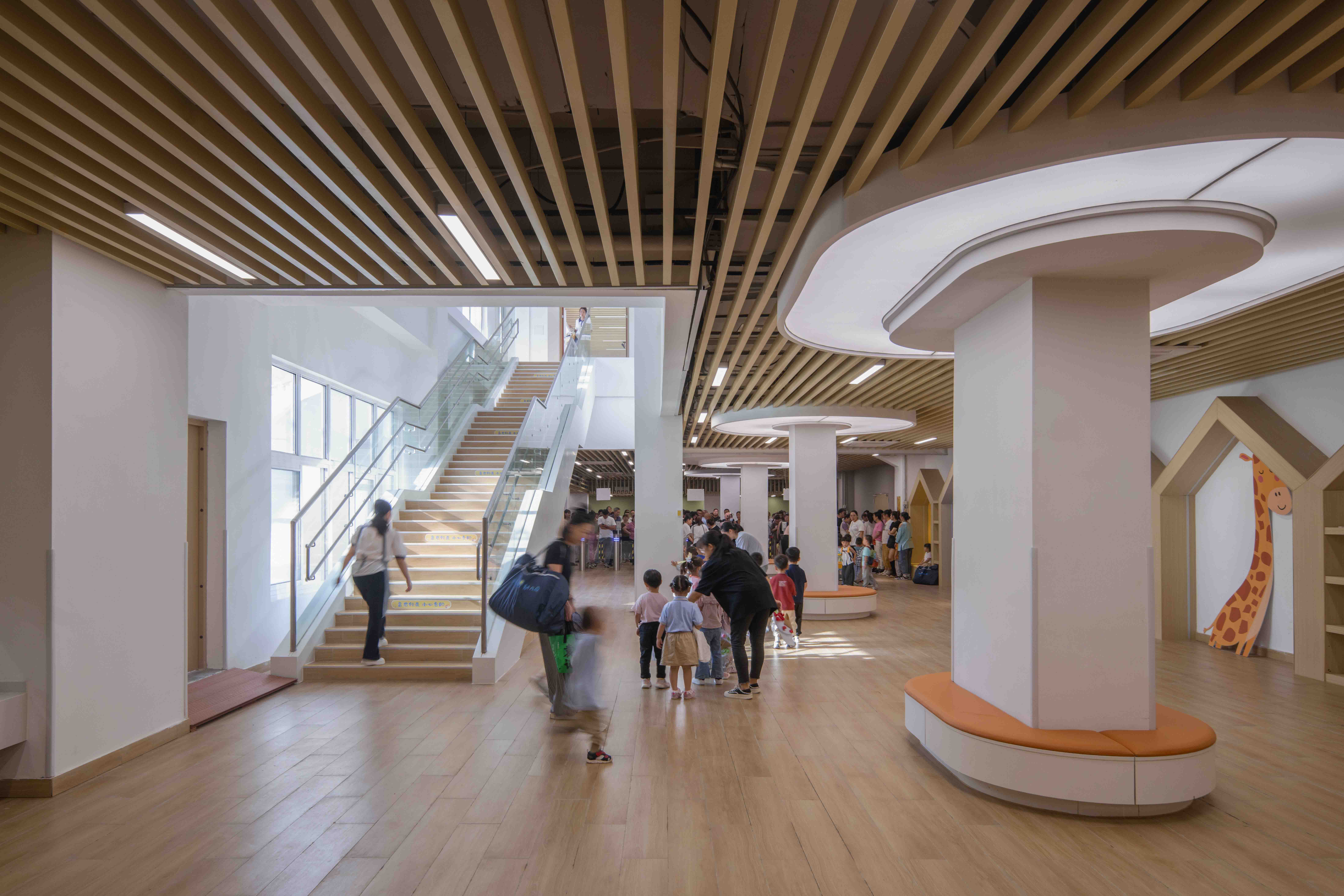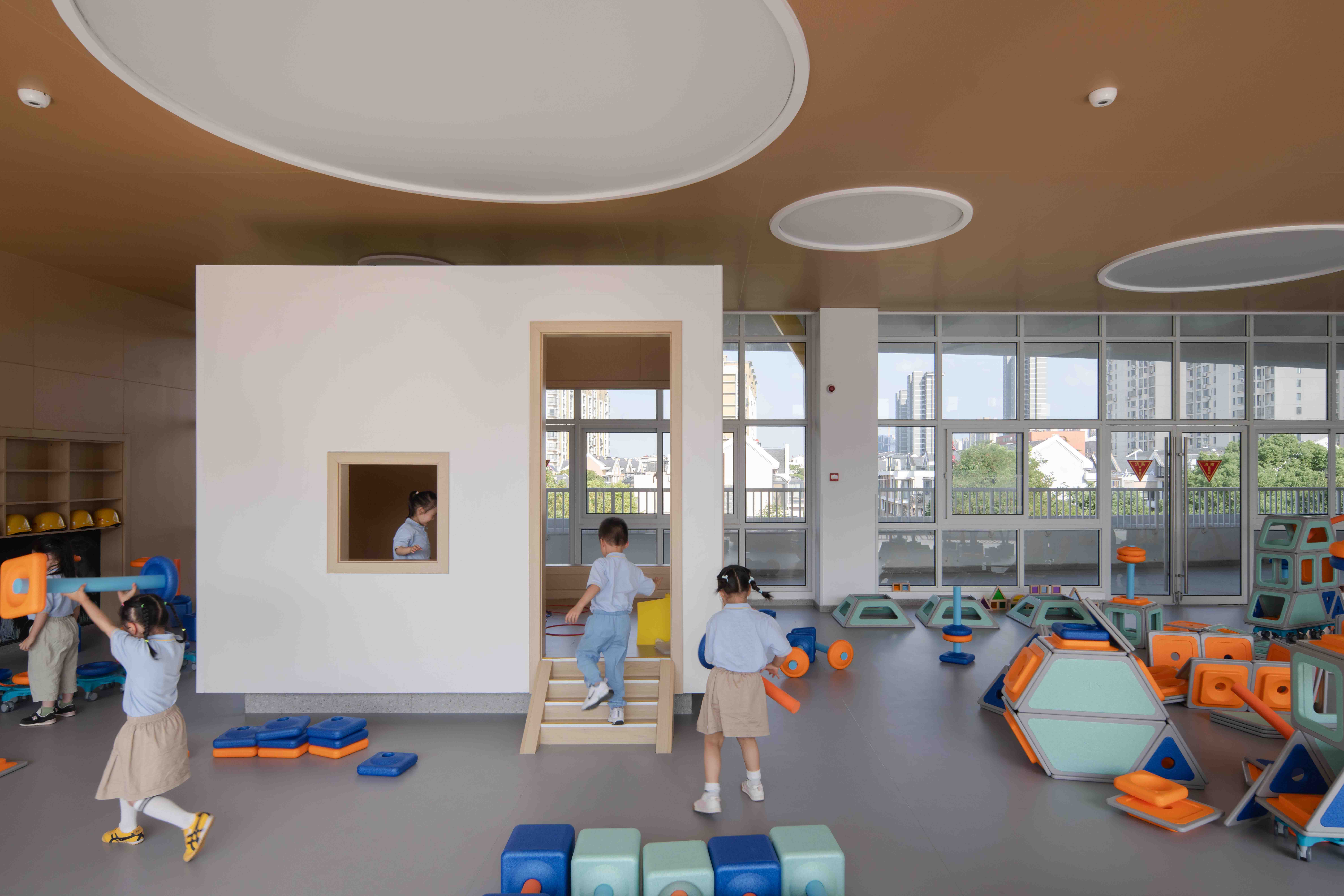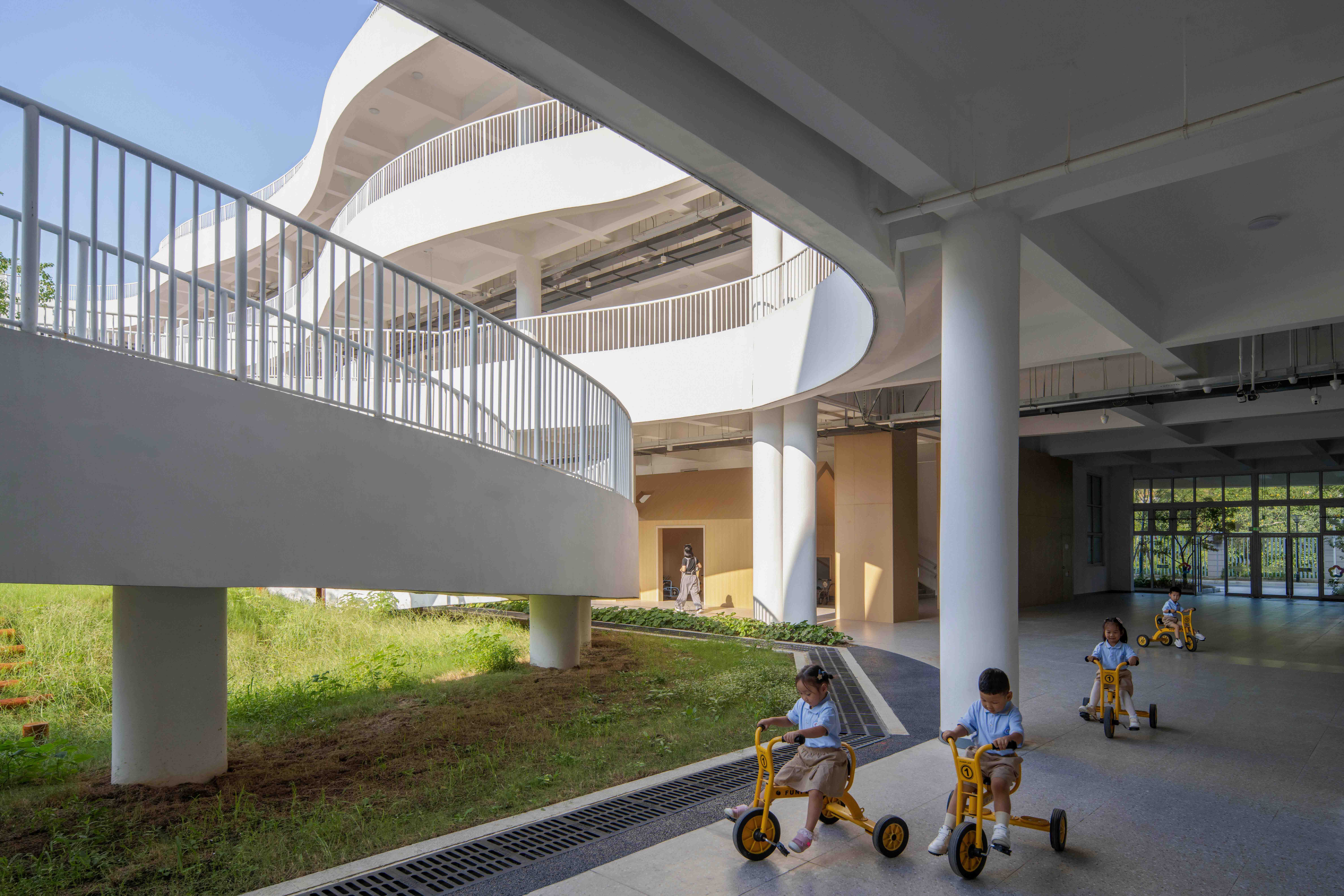 The kindergarten circulation is closed in a “loop” cycle, without end and starting point. Children like to run around in this endless circular space. Here they play like a cat chasing its tail. For children, running around is an innate motivation, growing up and discovering in running. Children will move in accordance with certain patterns. If the environment they are in can adapt to these patterns without any prompt, children will start to explore spontaneously.