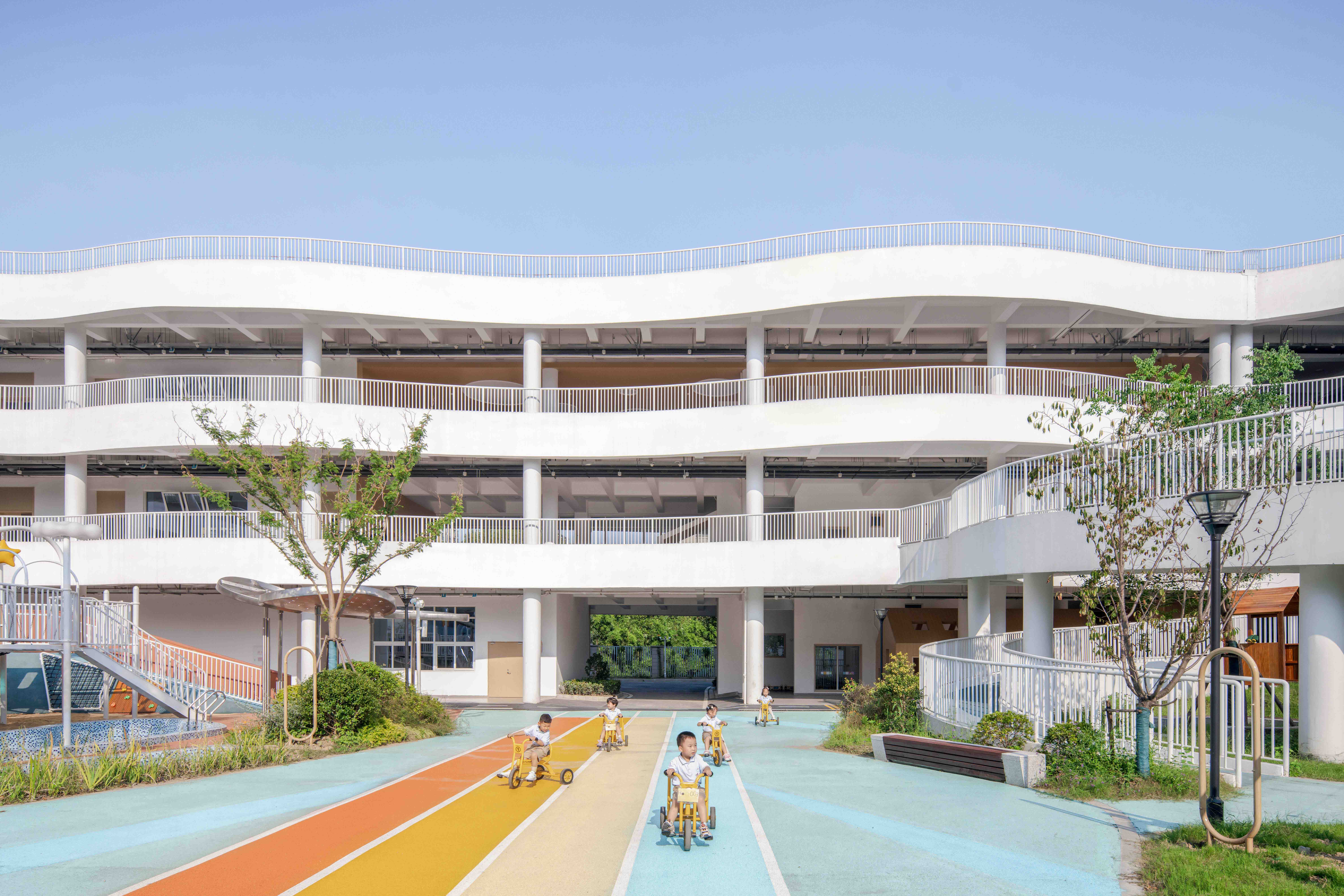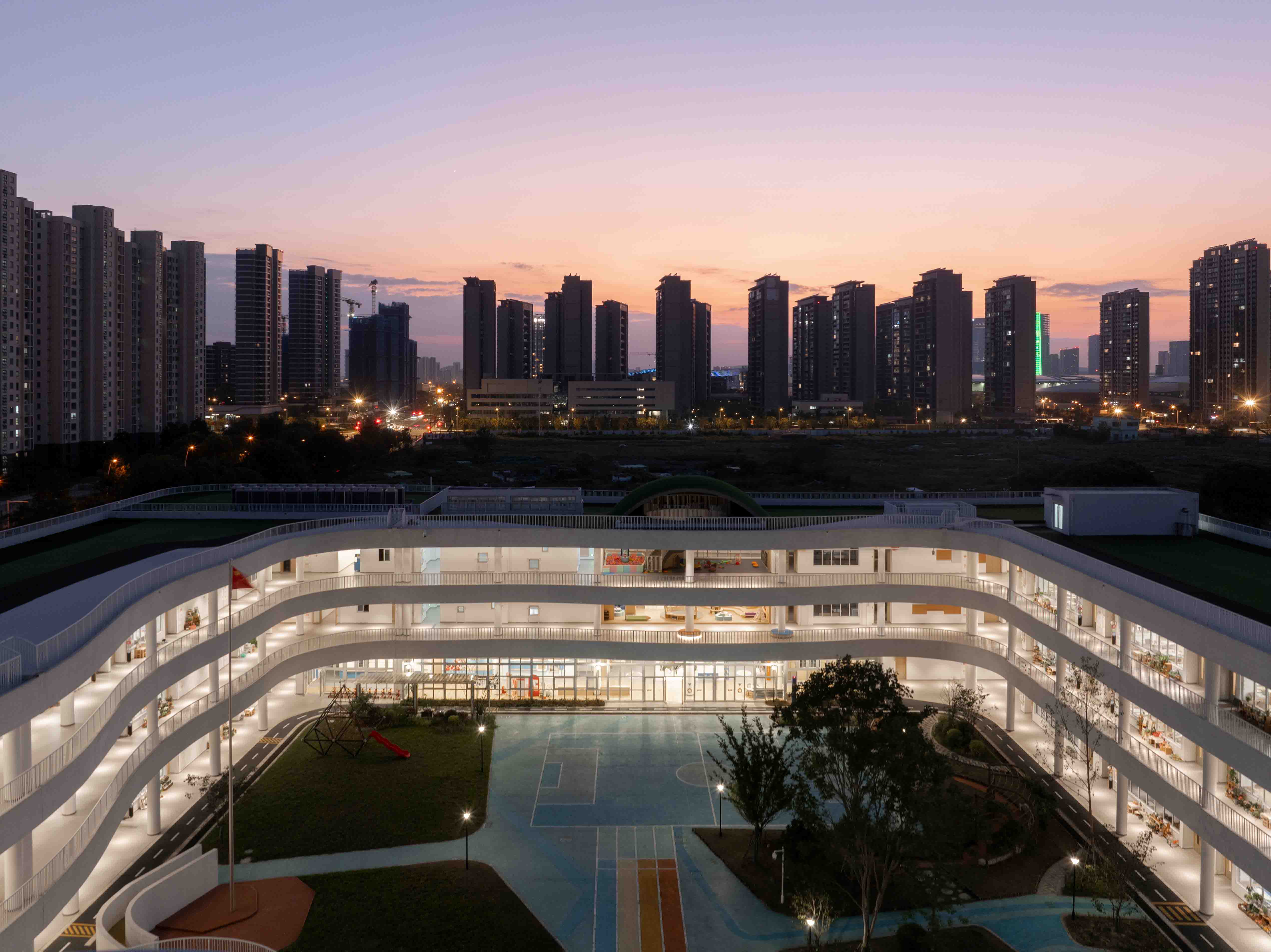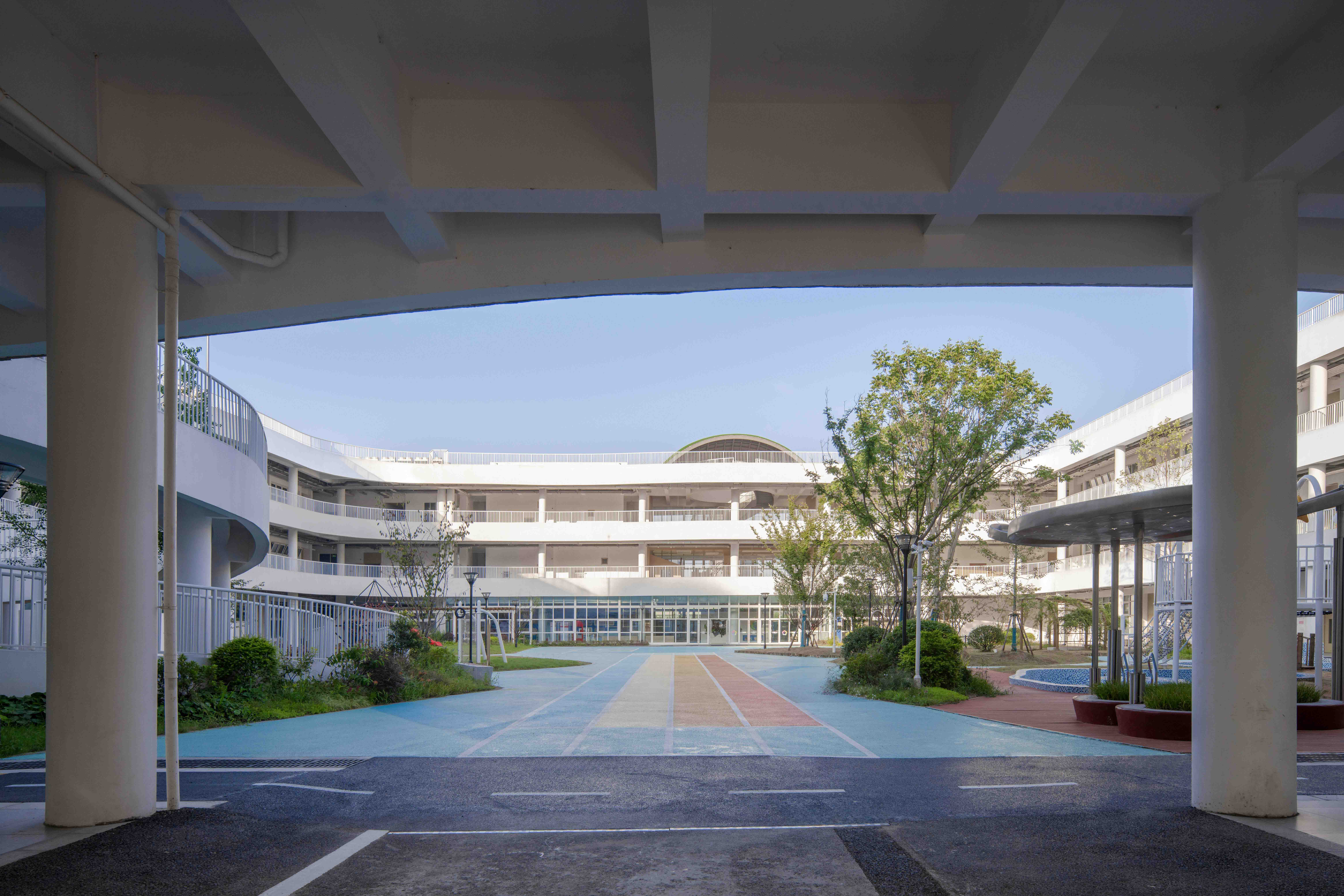 Watertown Kindergarten is located in Qingyan Road, Jingkai District, Wuxi City. It covers an area of 20,622 square meters, with a construction area of 26,109 square meters. It is a large kindergarten with 30 classes. With a closed courtyard layout, the space planning of one ring, two areas and four zones effectively organizes teaching, administration, office, logistics canteen, gymnasium and sports field around the circular circulation. “Loop” circulation connects the whole functional belt and enclose a childlike circle, children in this free life dynamic platform to play, observe, discover and symbiosis with nature.