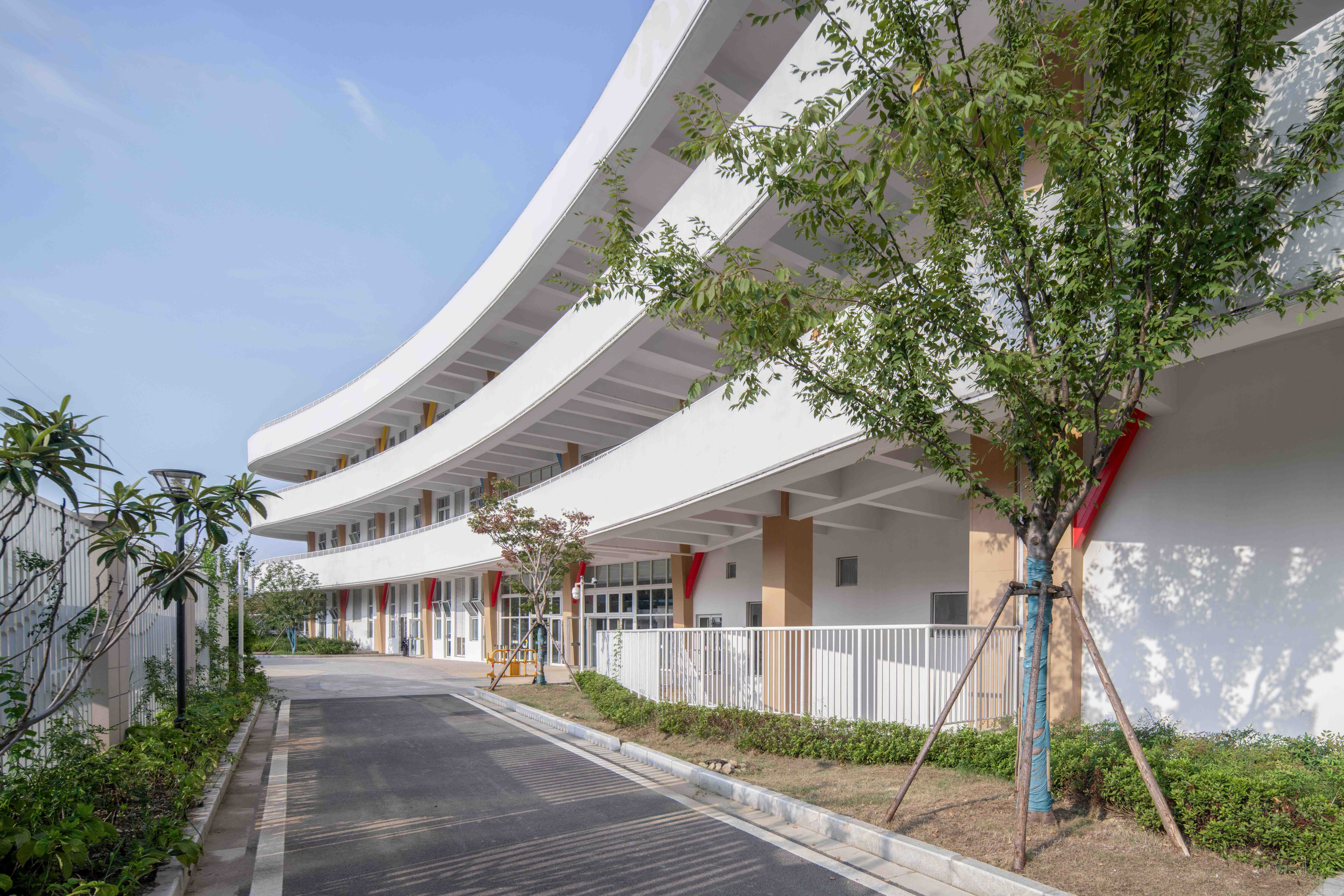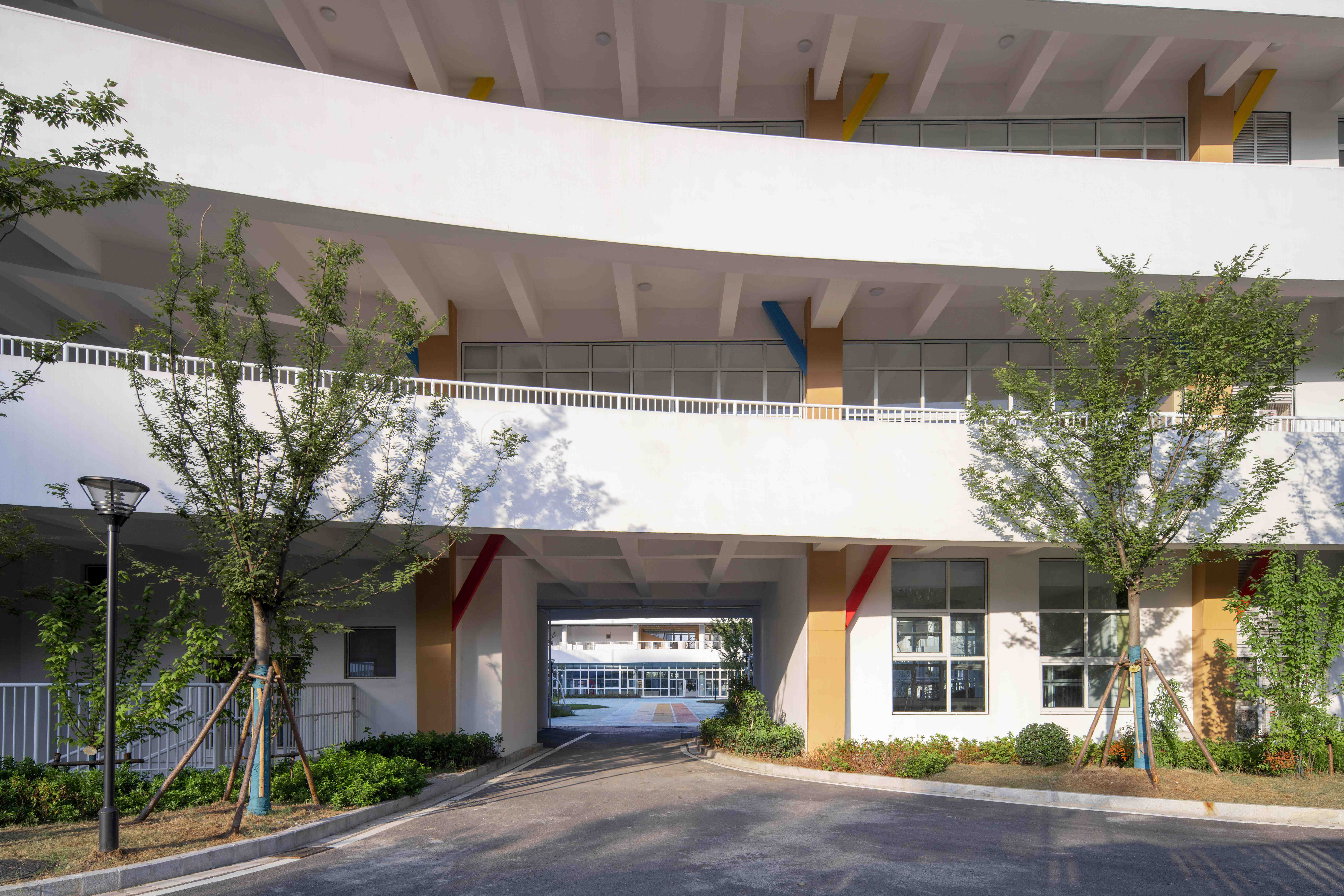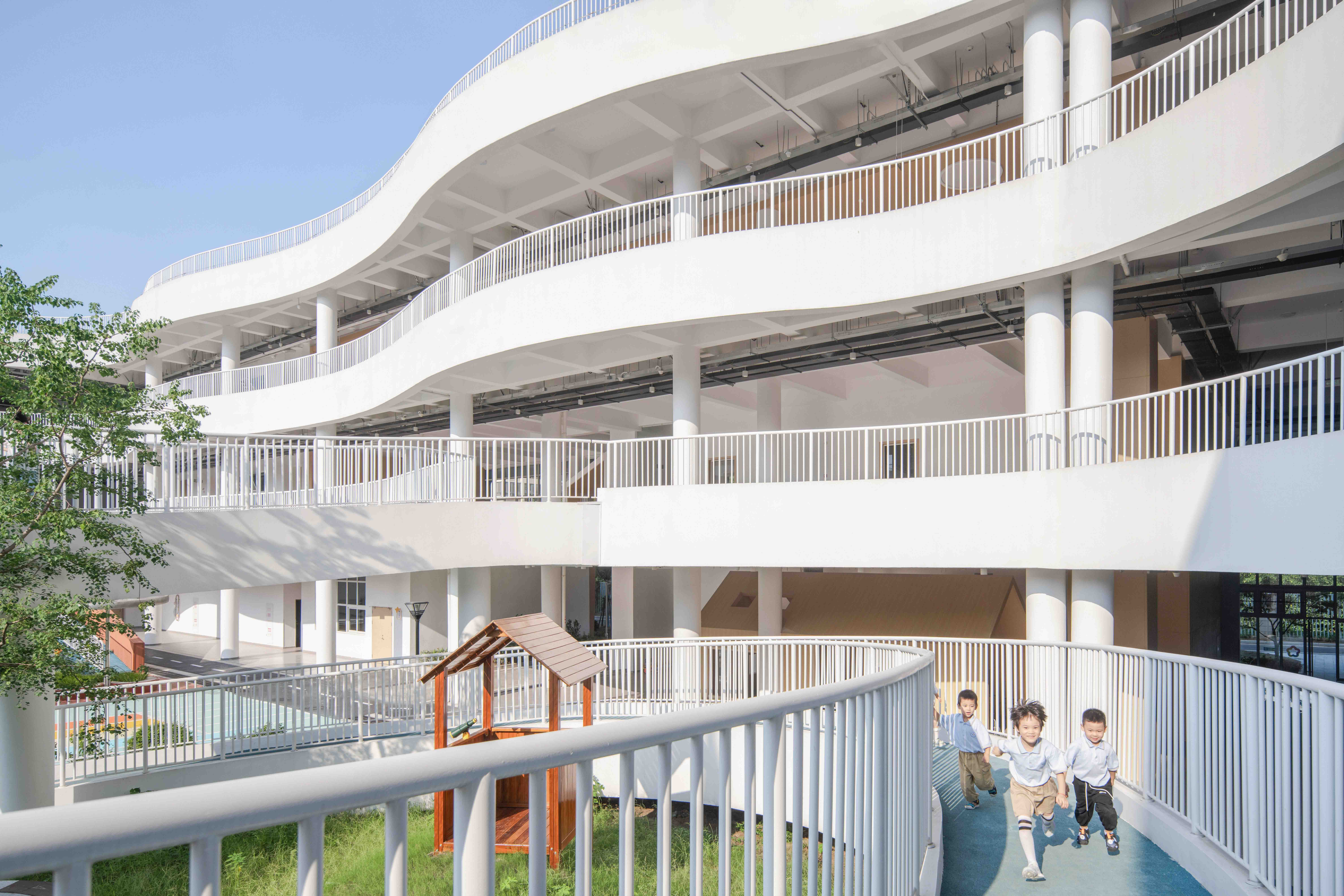 Watertown Kindergarten is located in Qingyan Road, Jingkai District, Wuxi City. It covers an area of 20,622 square meters, with a construction area of 26,109 square meters. It is a large kindergarten with 30 classes. With a closed courtyard layout, the space planning of one ring, two areas and four zones effectively organizes teaching, administration, office, logistics canteen, gymnasium and sports field around the circular circulation. “Loop” circulation connects the whole functional belt and enclose a childlike circle, children in this free life dynamic platform to play, observe, discover and symbiosis with nature.