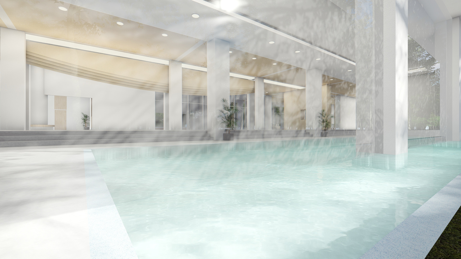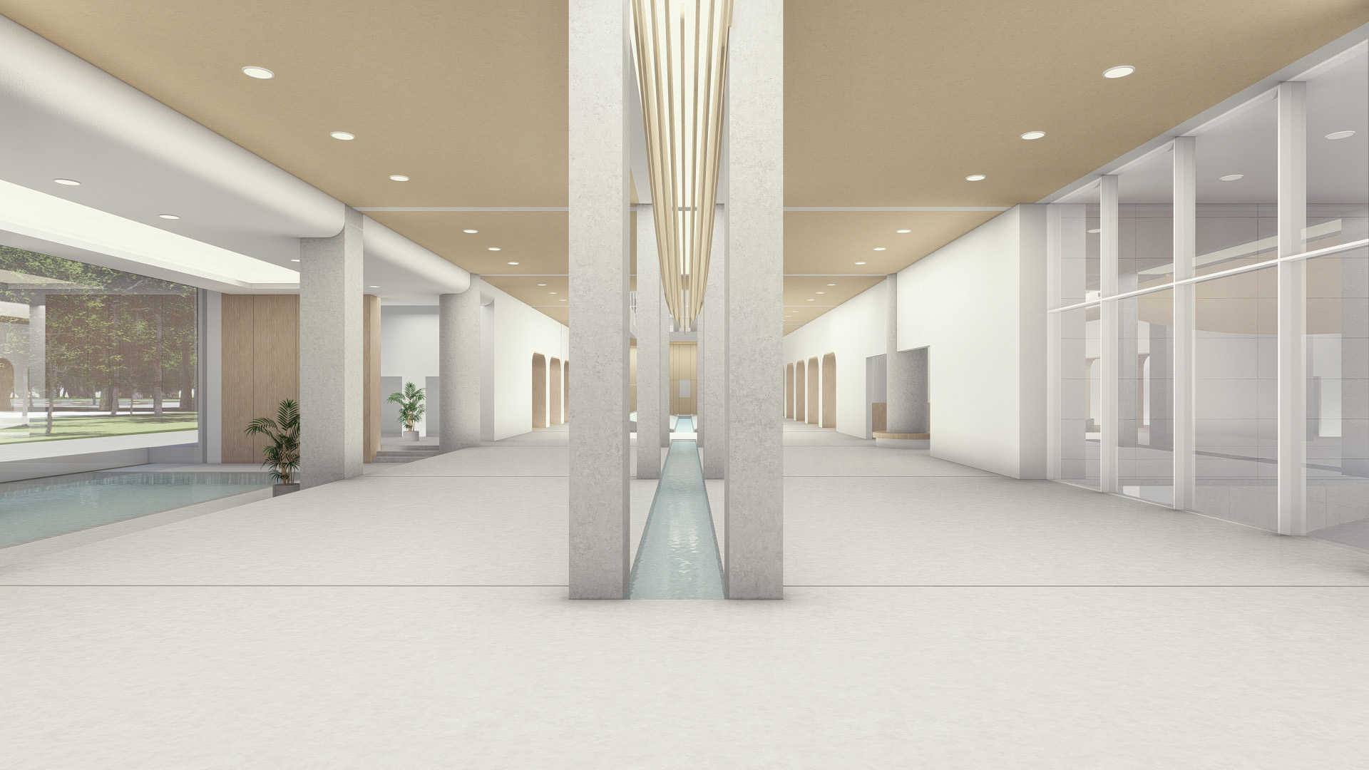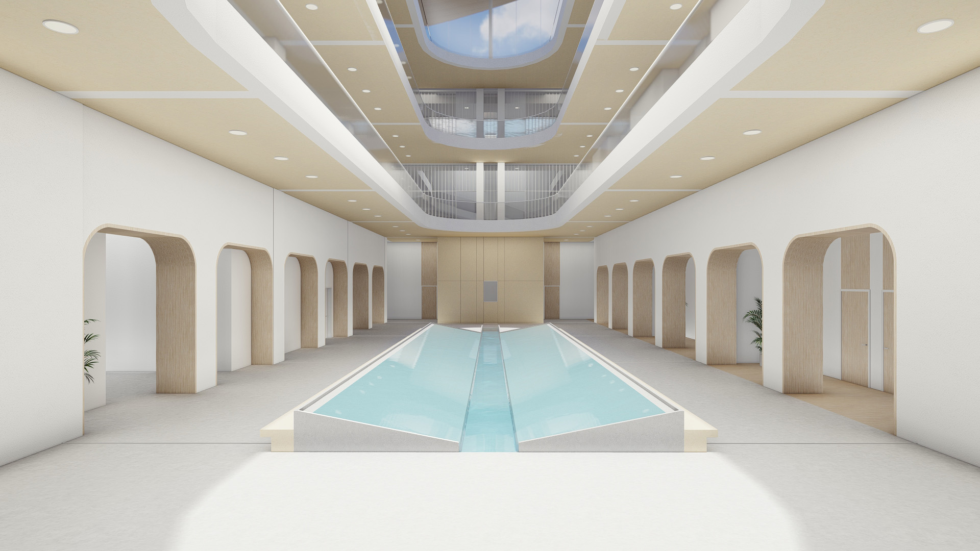Water is the source of life, hydrotherapy rehabilitation is to treat in the way of water, so as to achieve rehabilitation and healing. Water is introduced to divide the space and guide the space to create a scene, thus creating a healthy shore. Light direction, future, life and hope, horizontal water vertical fill light, the water surface ripples, water more vitality. Bathed in light and water, life is restored, healthy and growing.