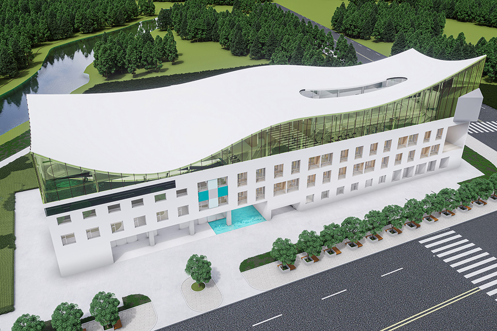 The building as a whole is consistent with the base, showing a simple rectangular volume. The concept of "water, streamers, waves and boats" is implanted in the roof, and the building is like a sailing ship docked on the shore, thus giving the patients a psychological comfort and hope. The space environment of the spa rehabilitation hospital should have the essence of healing, meditation, soothing and spirit. The floating roof, which is like a wave, seems to float above the forest on the north side, and the transparent interior "healing garden" is the climax of the case.