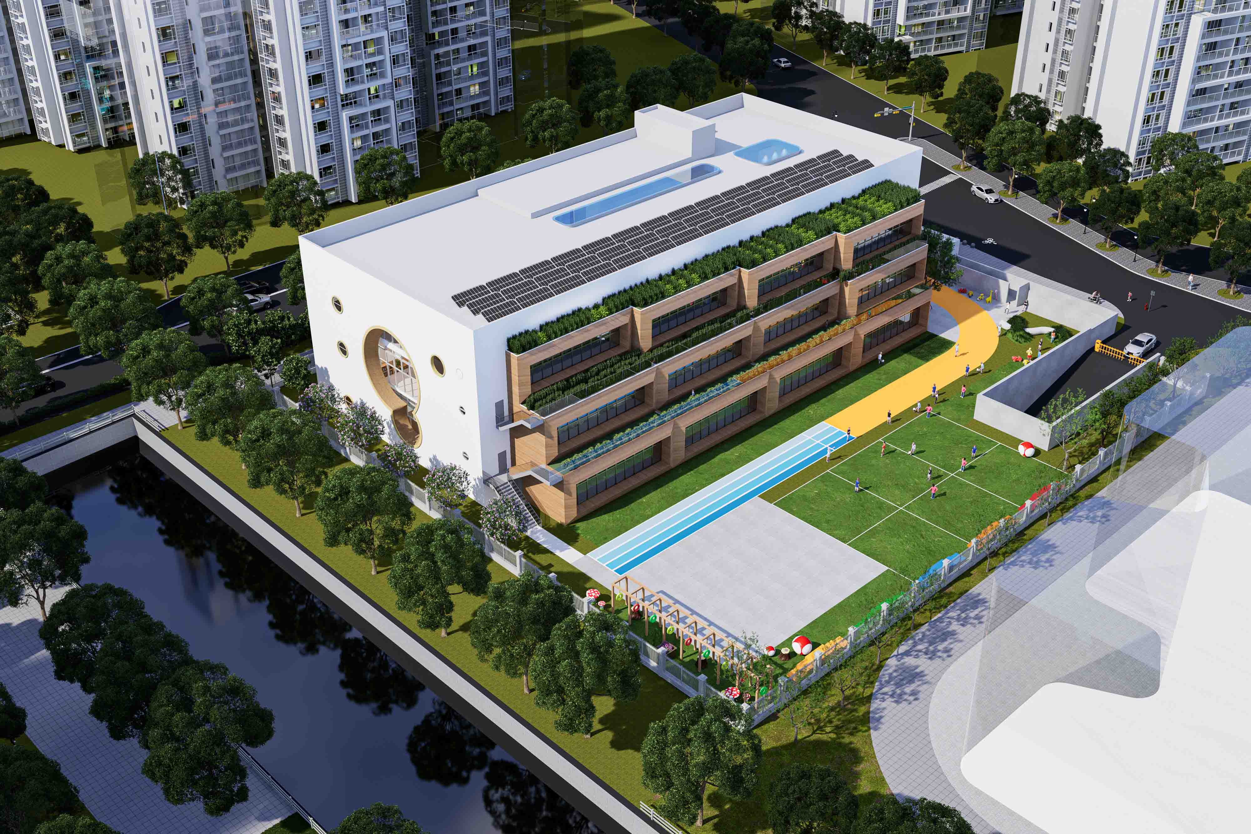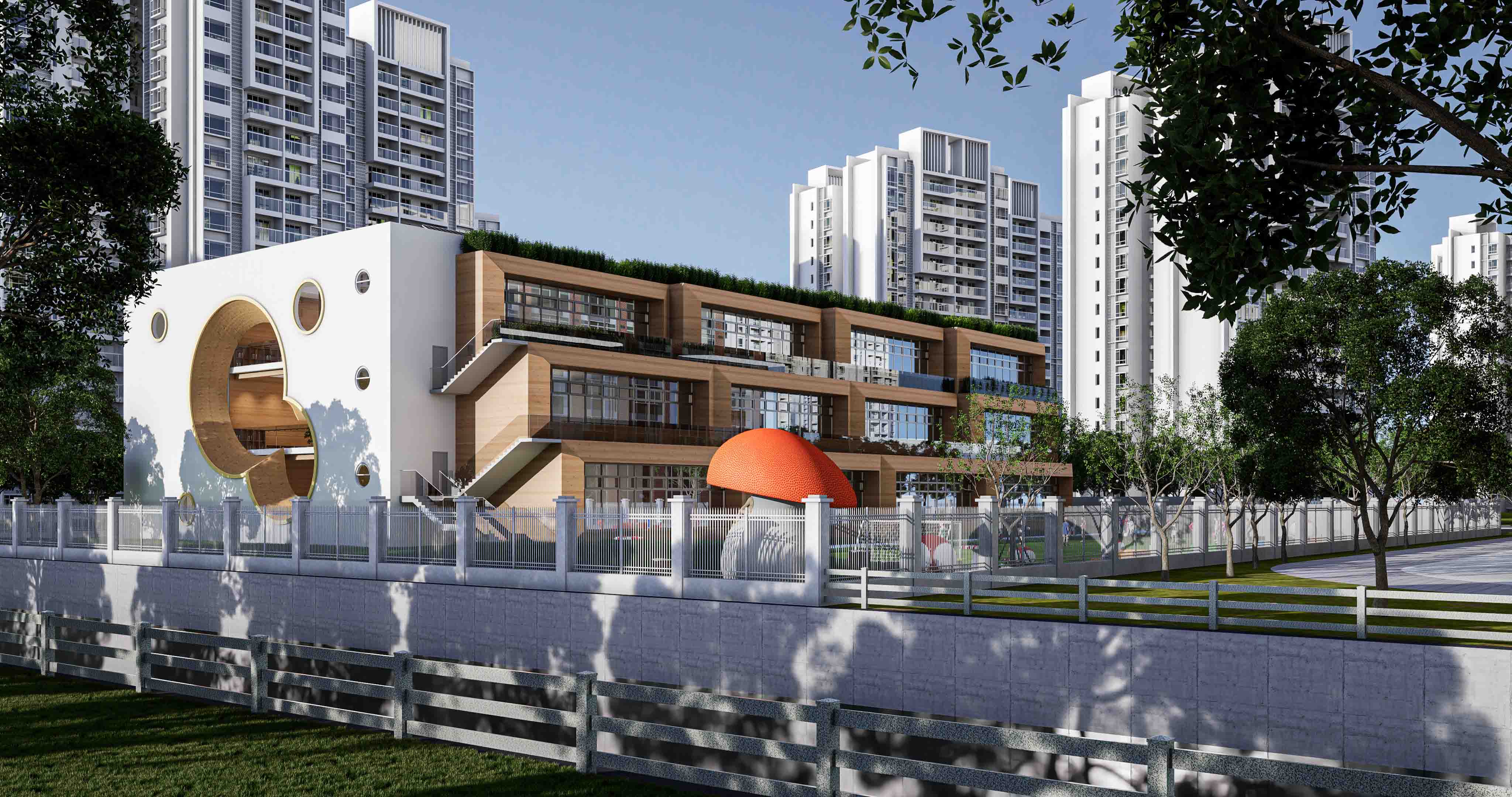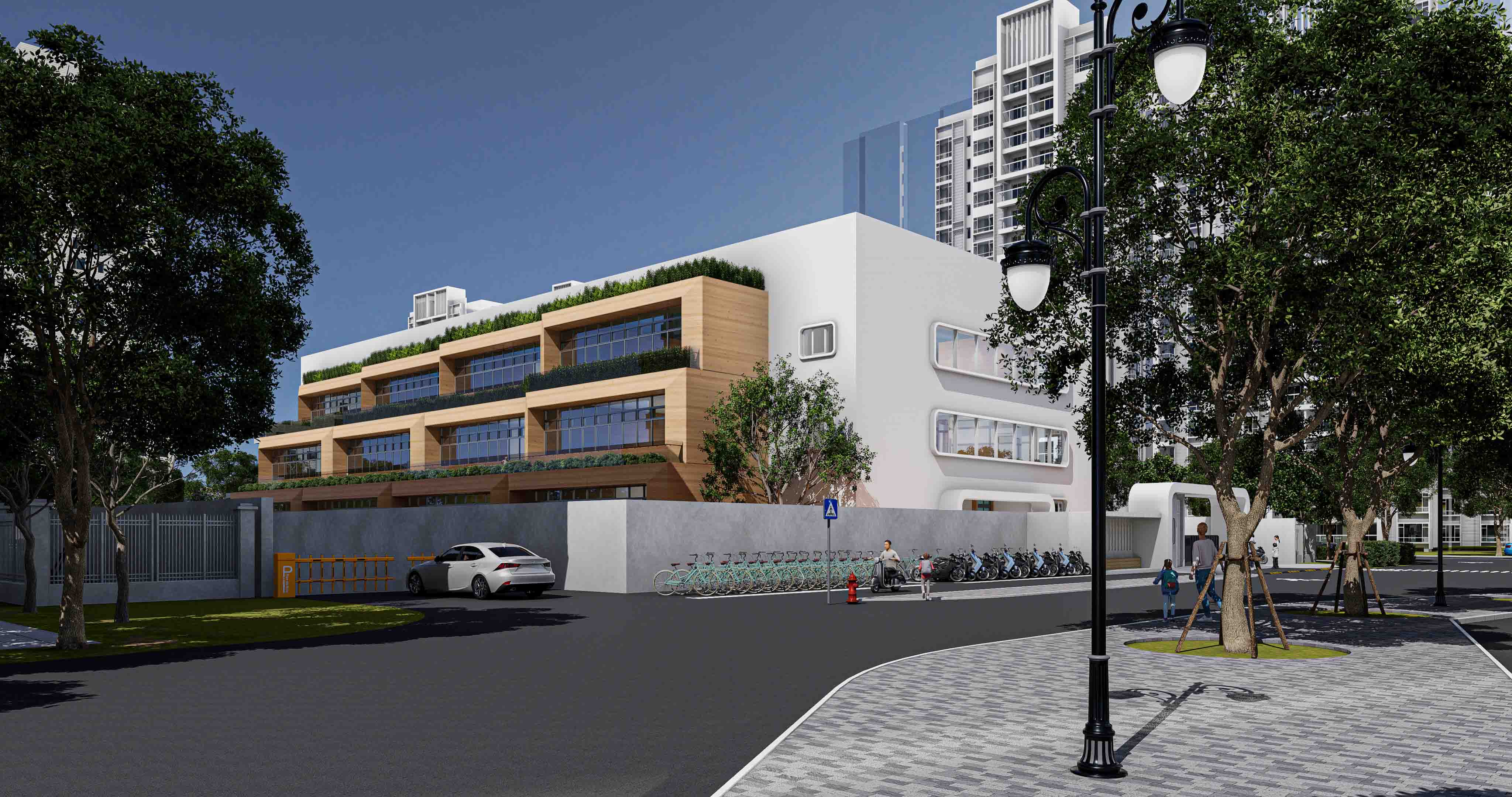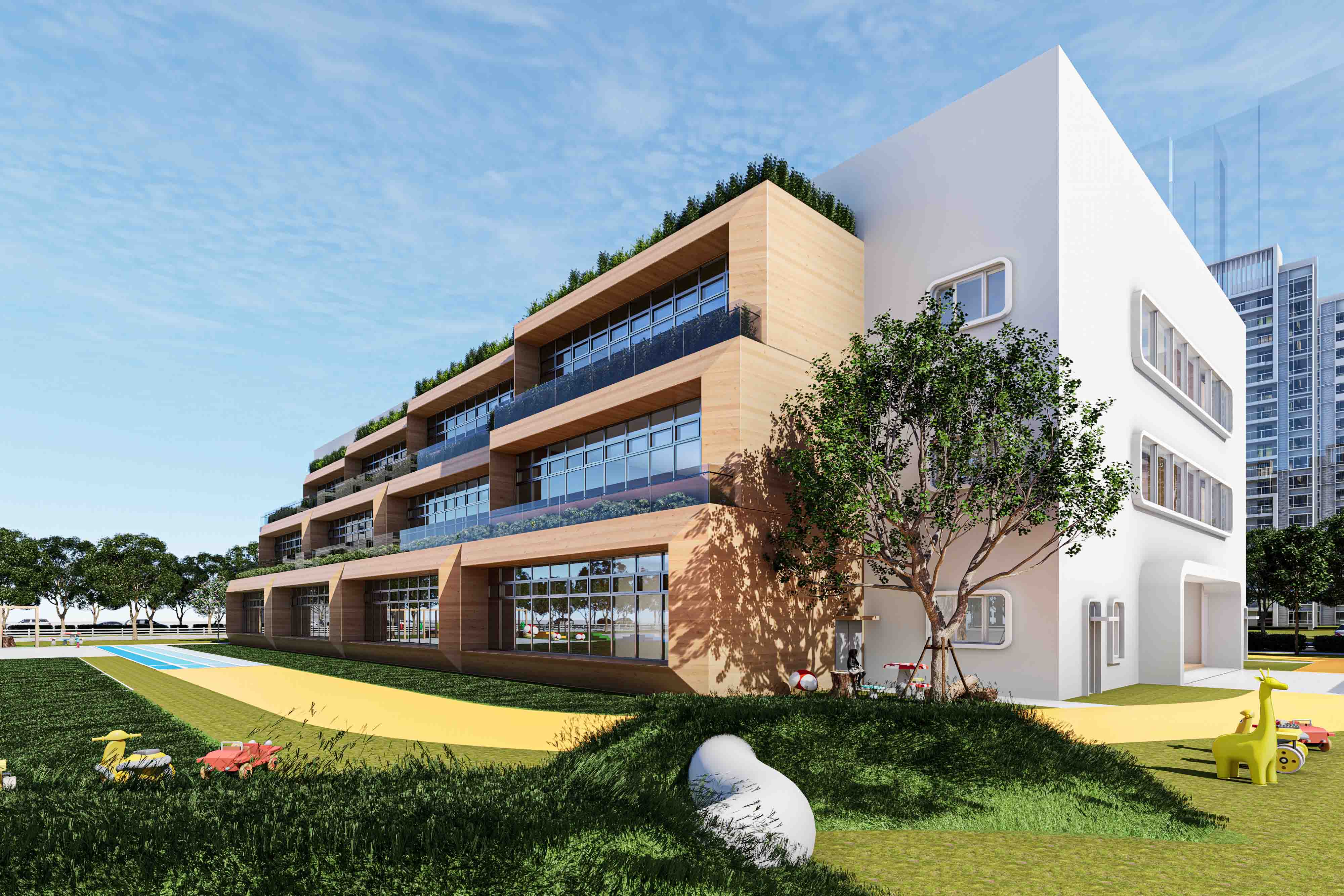 The project is located in the southeast of the intersection of Qingyuan Road and Gonghu Avenue, with 12 classes planned. The newly built kindergarten has a total land area of 5507.2 square meters, and a total construction area of 9527.7 square meters, including an aboveground construction area of 5426.9 square meters and an underground construction area of 4110.8 square meters. It includes newly built teaching rooms, administrative office rooms, multi-function halls, service rooms, auxiliary rooms, basements and so on. With the development concept of “TOD smart ecosystem”, a TOD ecological kindergarten is designed with the general guideline of “ecology, happiness and wisdom”.