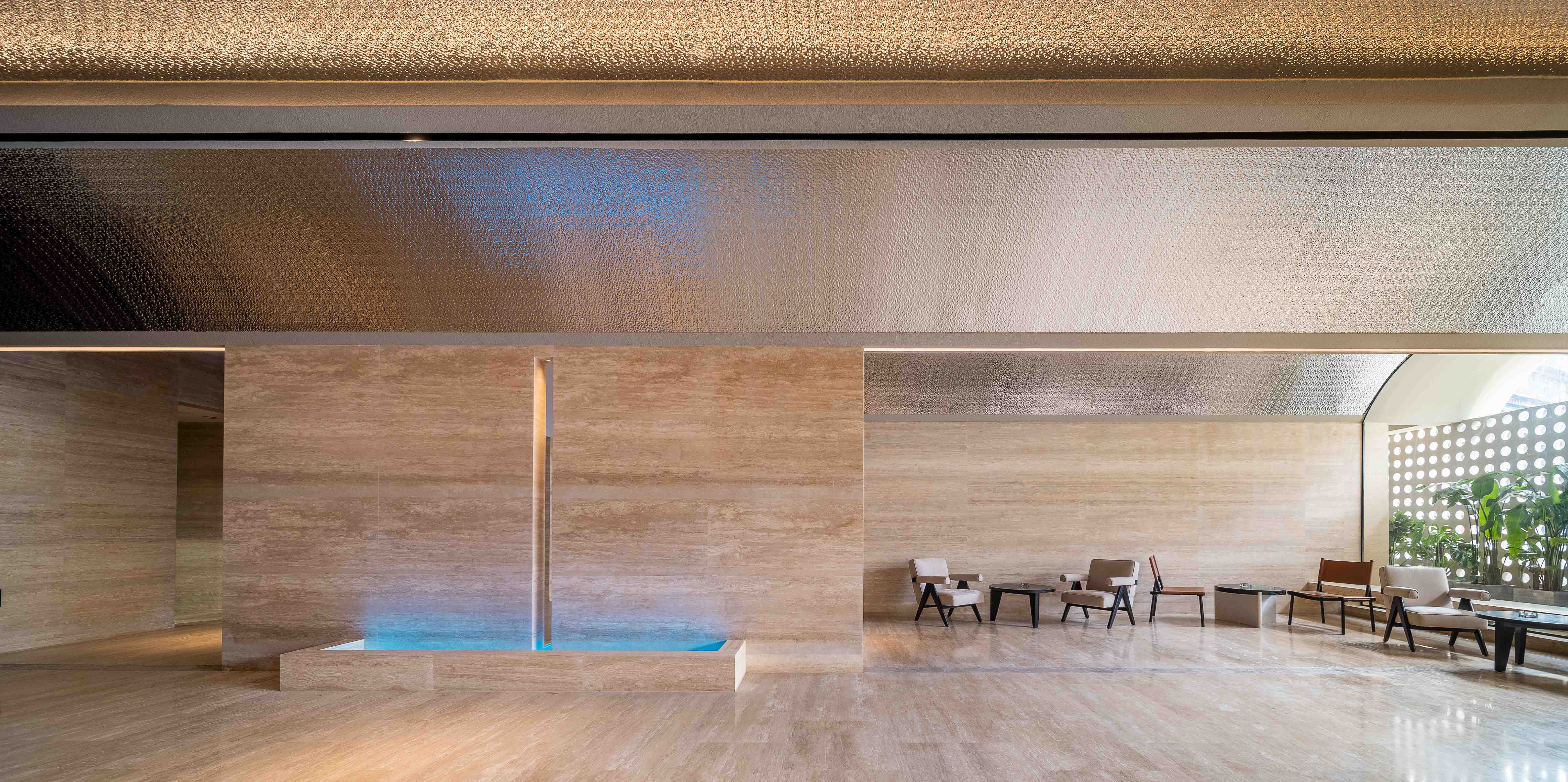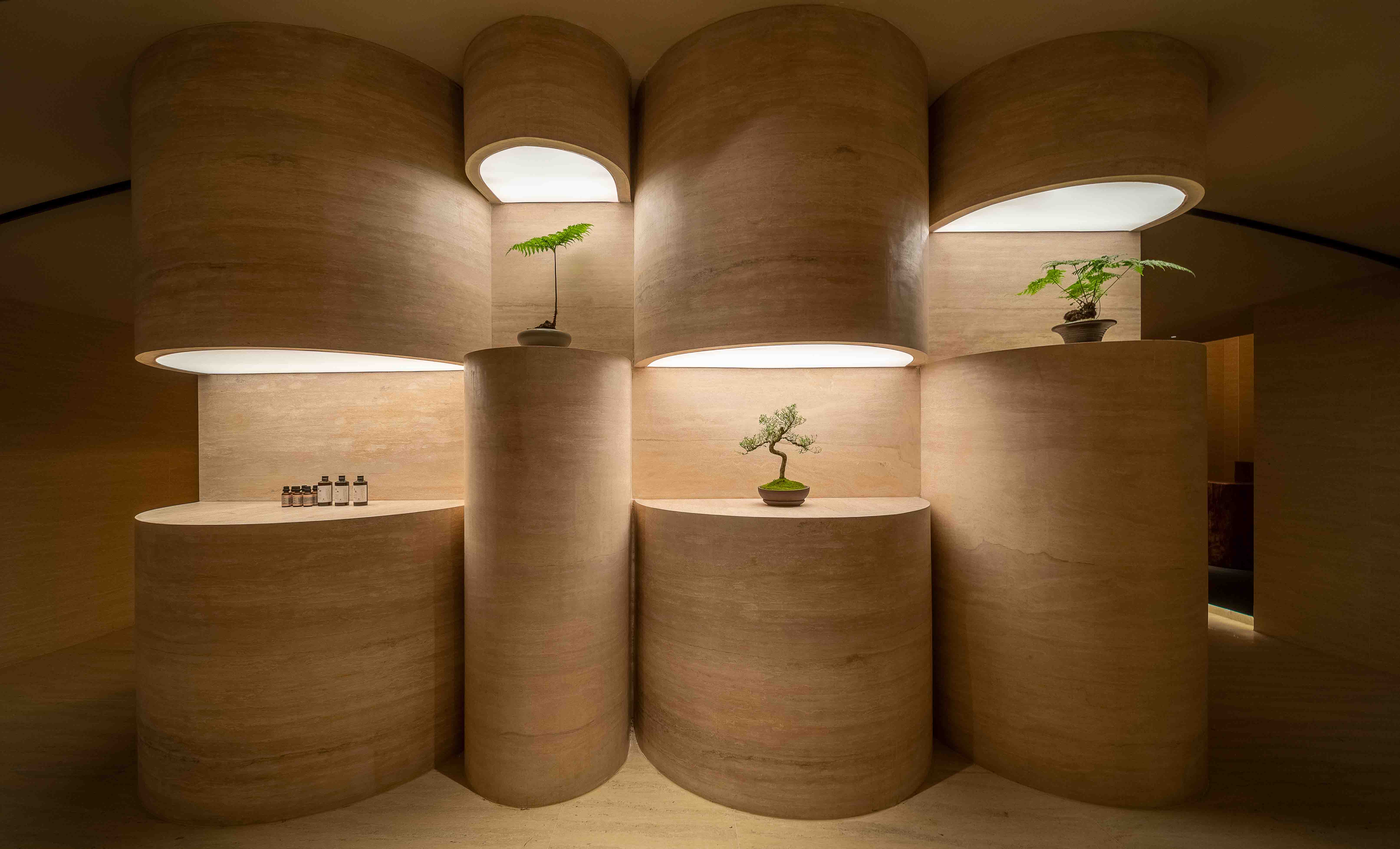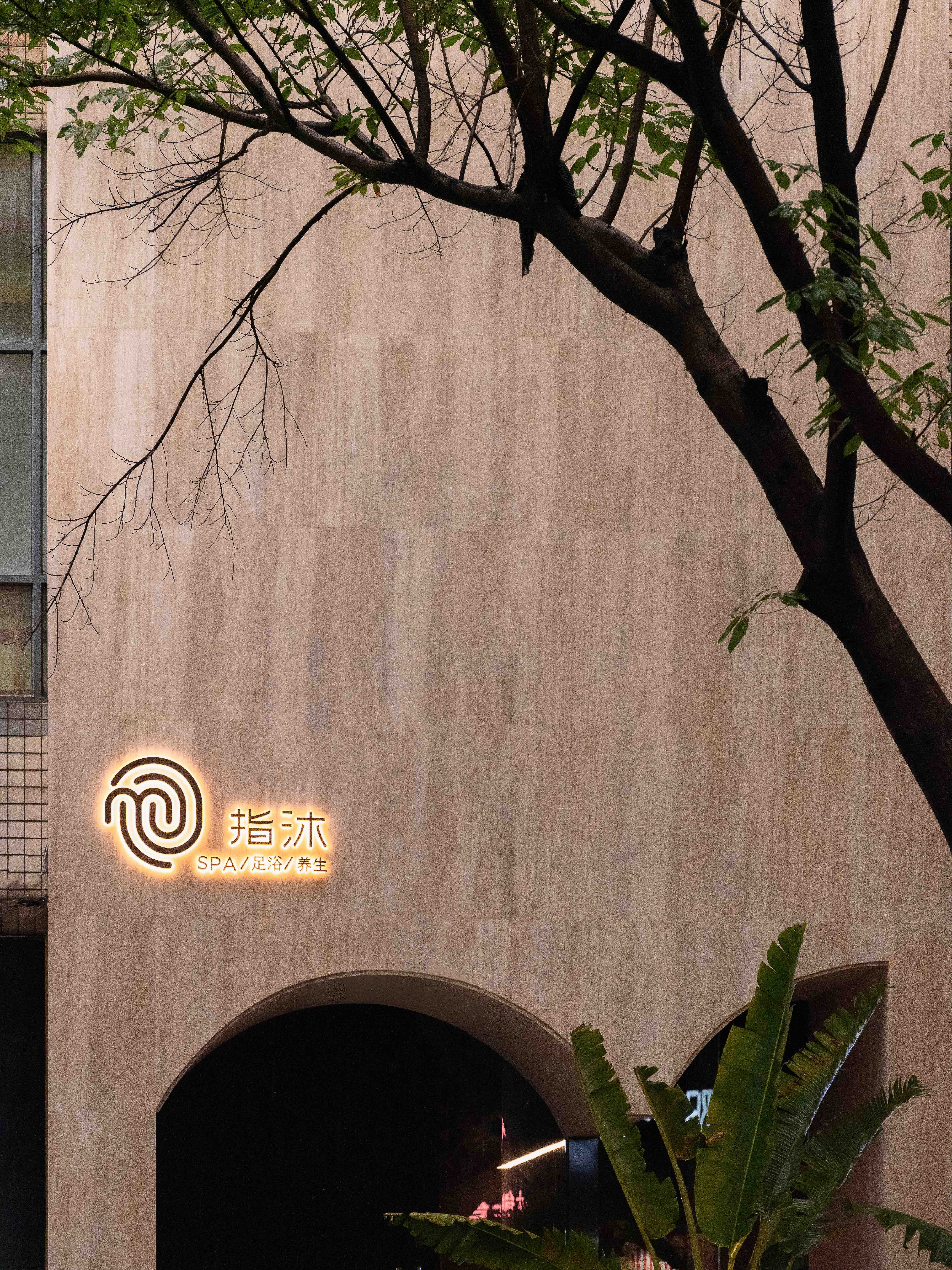 Lying on the third floor of Yongshengcheng commercial and residential building, Taijiang District, Fuzhou, ther hallway of the first-floor borders Laoyaozhou Street. The total construction area is about 3500 square meters, a large-scale of foot spa chain stores.A travertine facade cut the noisy and busy from city life. The bustling crowds stop and lock their eyes on the deep of arched portal. The customers seem to throw old things ways slowly when step into the hallway on the first floor, with tranquil black wall. Upping to the lobby of the third floor, a new memory is evoked from the embedded rockery bonsai.The cambered light gallery of whole corrugated metal vault connects the future and the past like a time tunnel. The light and shadow of green plants guide customers to the quiet waiting area.The texture of the surrounding natural stone is like a Song Dynasty Landscaper painting. The screen gap opposite the reception as if waterfall in a mountain stream, cascading down, and plashing blue waves. The black vertical curved semi-circular stone wall on the left as though lofty mountains pointing towards to sky.Although there is only a wall between the noisy crowds and the hall, the customers seem already swimming in the landscape painting, bathing in the soft sunshine outside, and waiting for the spa service.Food bath and food spa originated in China, while hydrotherapy spa predates Europe. This project is to integrate Chinese and Western cultures. The arch is an ancient architectural element of China. By the variation of the arch, the regional functions are divided, thus connecting the Chinese and Western cultures and creating a place of health and leisure from ancient to modern.Stepping in, the customers can feel warm and relaxed from rough.The water axis of the middle corridor, which symbolizes the spirit of nature, divides into four areas, the tea room, rest hall, dining room and bathing area. The two ends of the water axis are the rest hall and the foot spa area, respectively. Around the core tube of the commercial and residential building, the foot spa is divided into five parts based on five elements and five colors: yellow, red, black, white(rooms), and cyan(hot spring and pool area).By the retrusive and curved surface, the three moving line conversion area shape a landscape artistic conception.