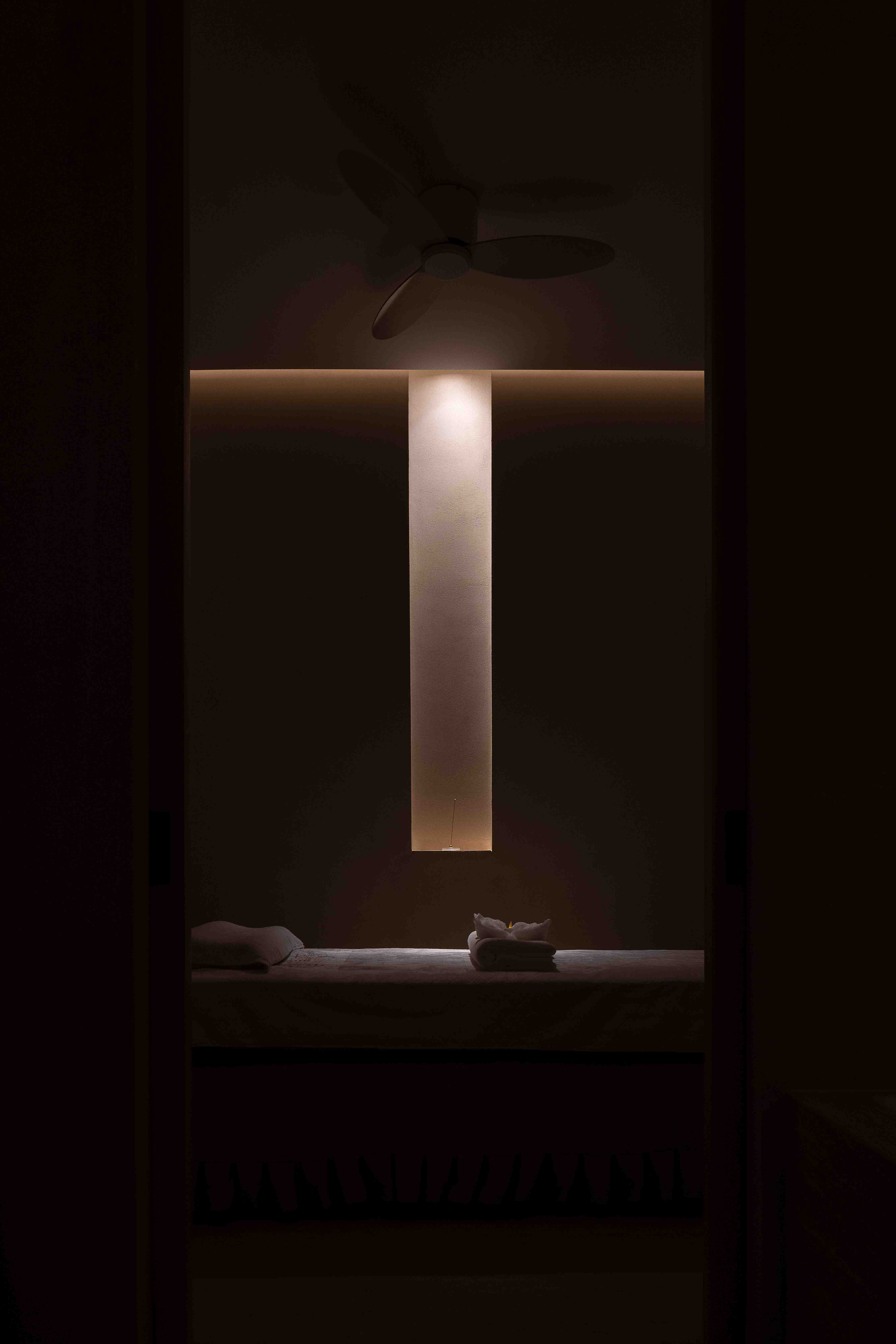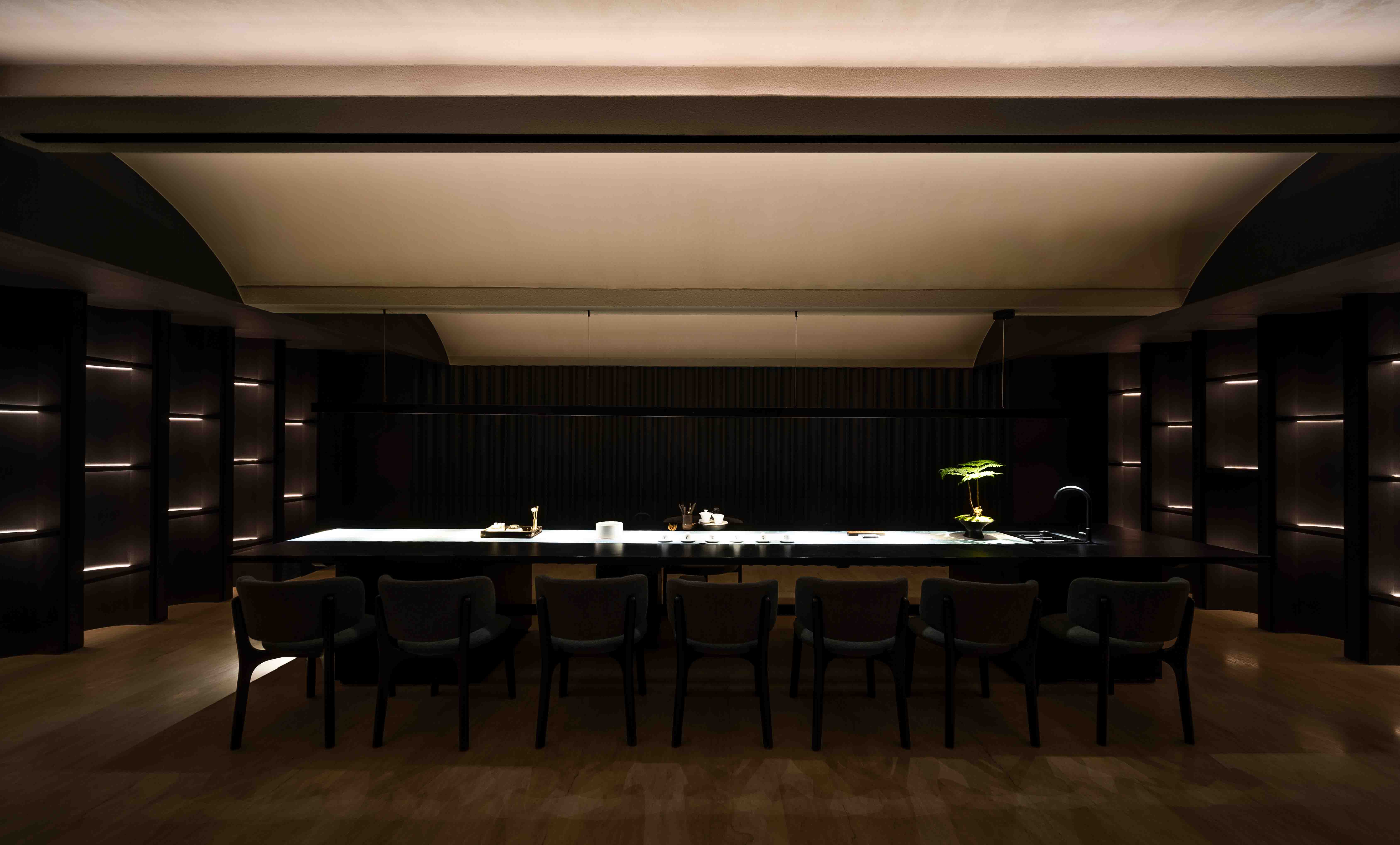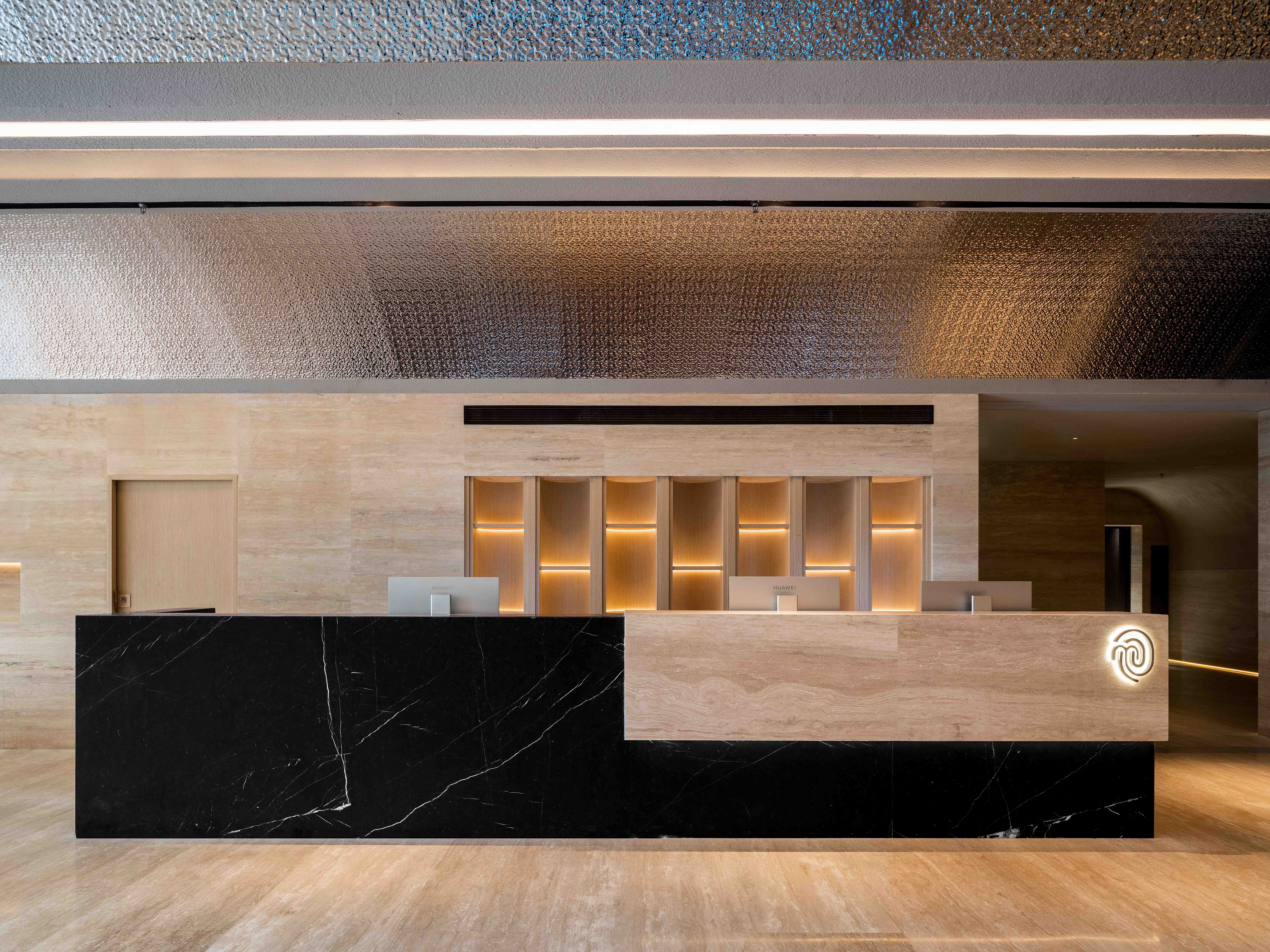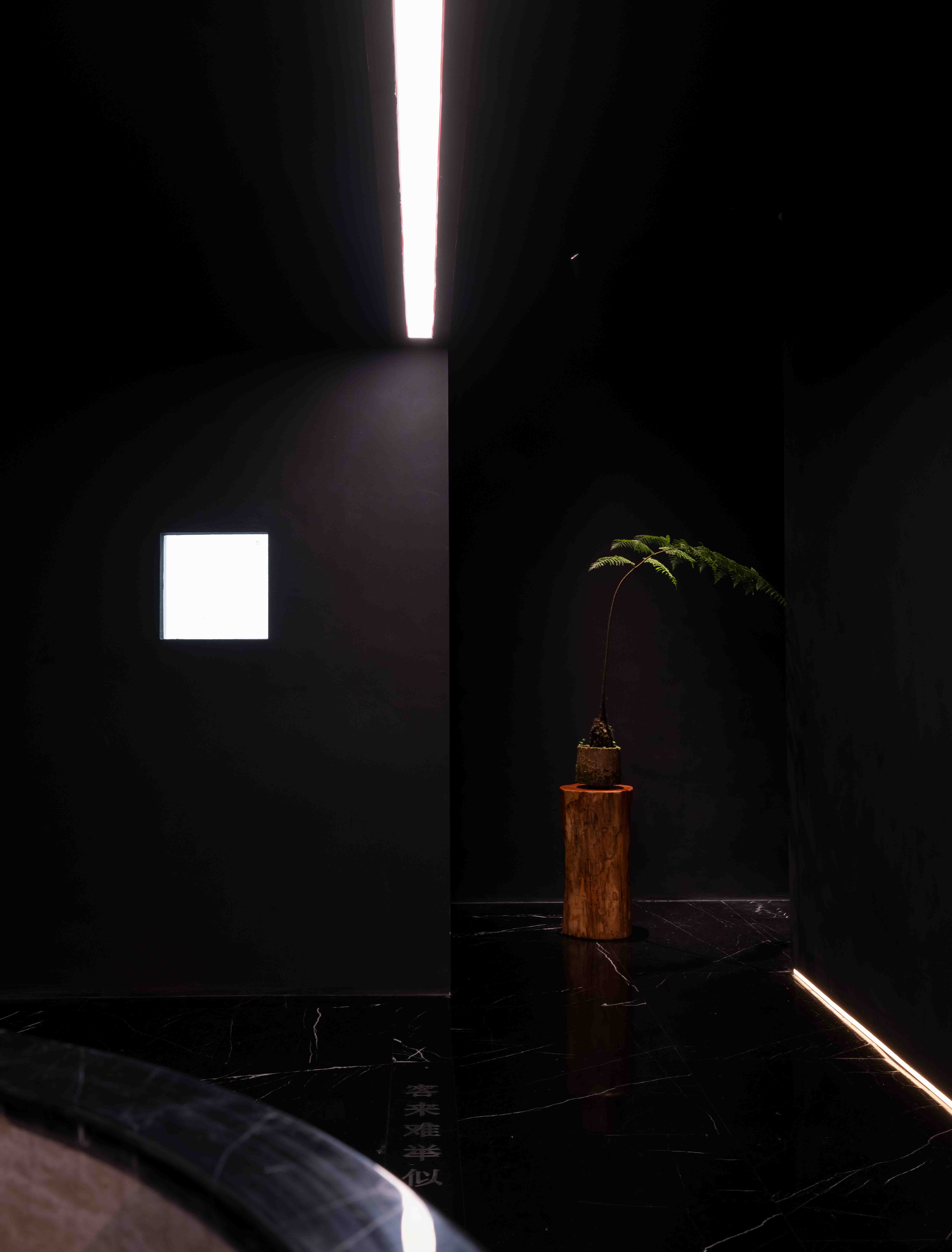 Lying on the third floor of Yongshengcheng commercial and residential building, Taijiang District, Fuzhou, ther hallway of the first-floor borders Laoyaozhou Street. The total construction area is about 3500 square meters, a large-scale of foot spa chain stores.A travertine facade cut the noisy and busy from city life. The bustling crowds stop and lock their eyes on the deep of arched portal. The customers seem to throw old things ways slowly when step into the hallway on the first floor, with tranquil black wall. Upping to the lobby of the third floor, a new memory is evoked from the embedded rockery bonsai.The cambered light gallery of whole corrugated metal vault connects the future and the past like a time tunnel. The light and shadow of green plants guide customers to the quiet waiting area.The texture of the surrounding natural stone is like a Song Dynasty Landscaper painting. The screen gap opposite the reception as if waterfall in a mountain stream, cascading down, and plashing blue waves. The black vertical curved semi-circular stone wall on the left as though lofty mountains pointing towards to sky.Although there is only a wall between the noisy crowds and the hall, the customers seem already swimming in the landscape painting, bathing in the soft sunshine outside, and waiting for the spa service.Food bath and food spa originated in China, while hydrotherapy spa predates Europe. This project is to integrate Chinese and Western cultures. The arch is an ancient architectural element of China. By the variation of the arch, the regional functions are divided, thus connecting the Chinese and Western cultures and creating a place of health and leisure from ancient to modern.Stepping in, the customers can feel warm and relaxed from rough.The water axis of the middle corridor, which symbolizes the spirit of nature, divides into four areas, the tea room, rest hall, dining room and bathing area. The two ends of the water axis are the rest hall and the foot spa area, respectively. Around the core tube of the commercial and residential building, the foot spa is divided into five parts based on five elements and five colors: yellow, red, black, white(rooms), and cyan(hot spring and pool area).By the retrusive and curved surface, the three moving line conversion area shape a landscape artistic conception.