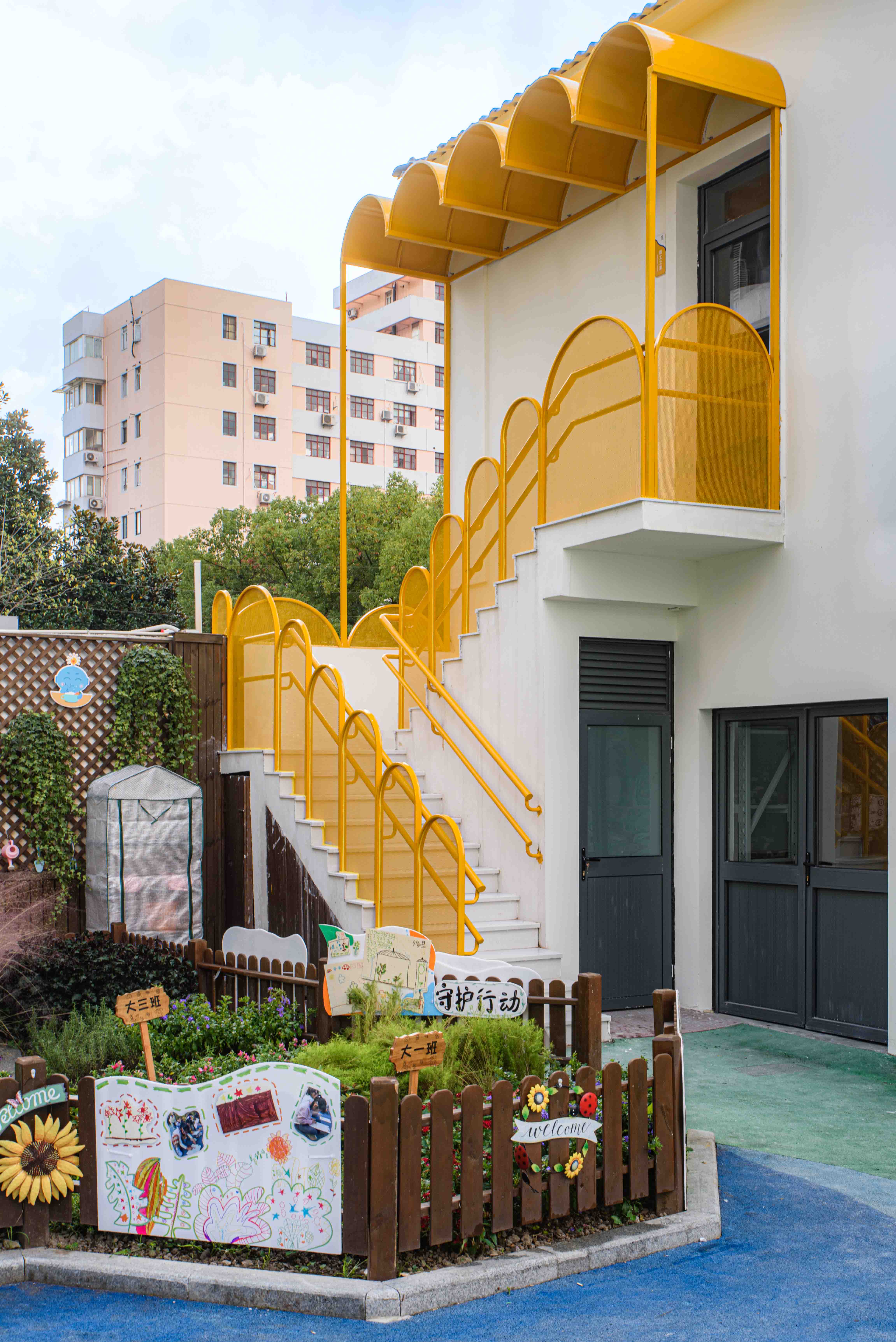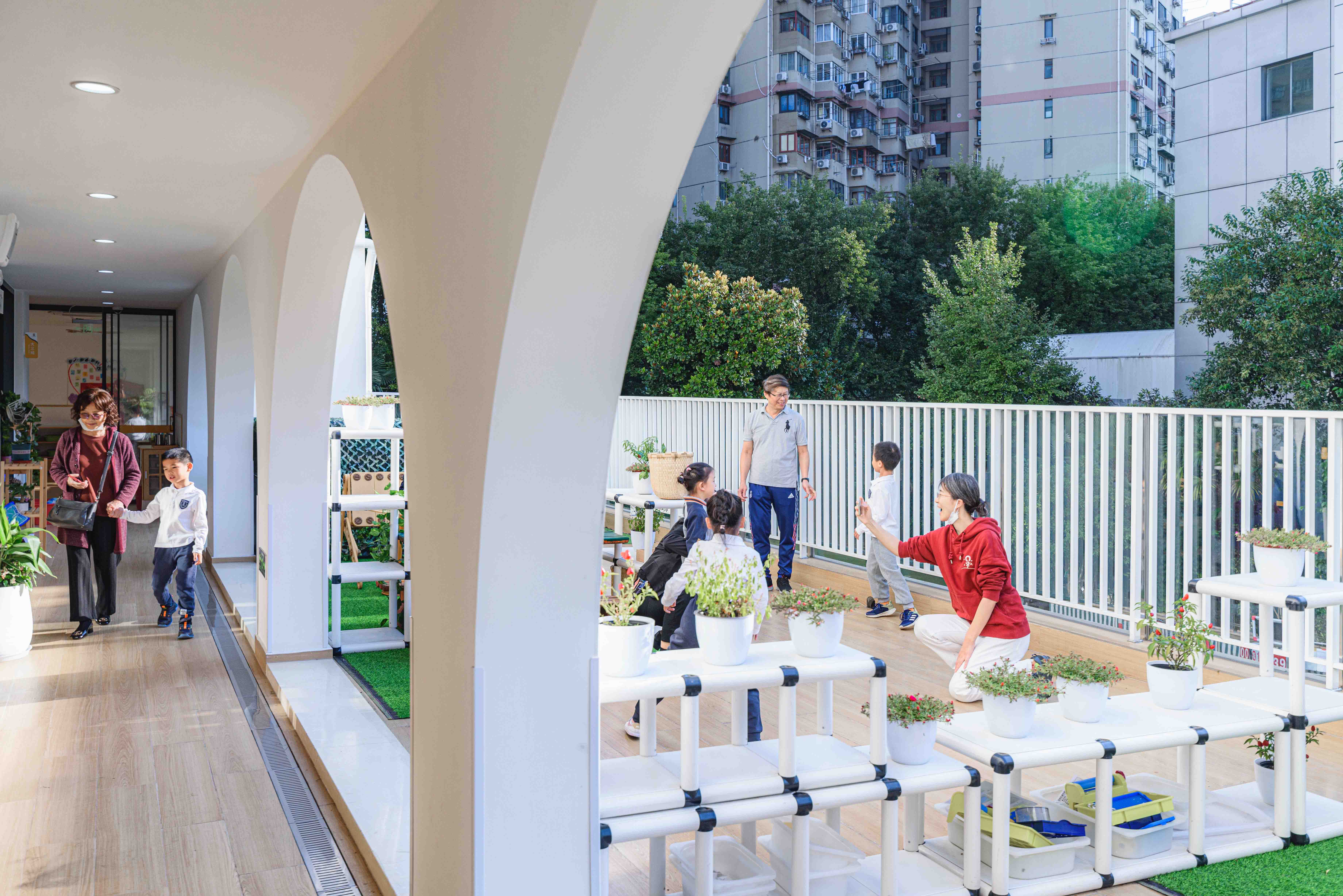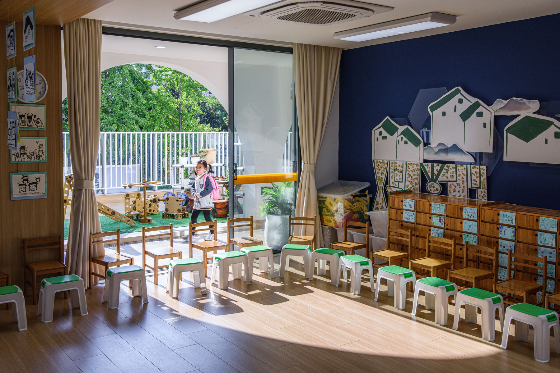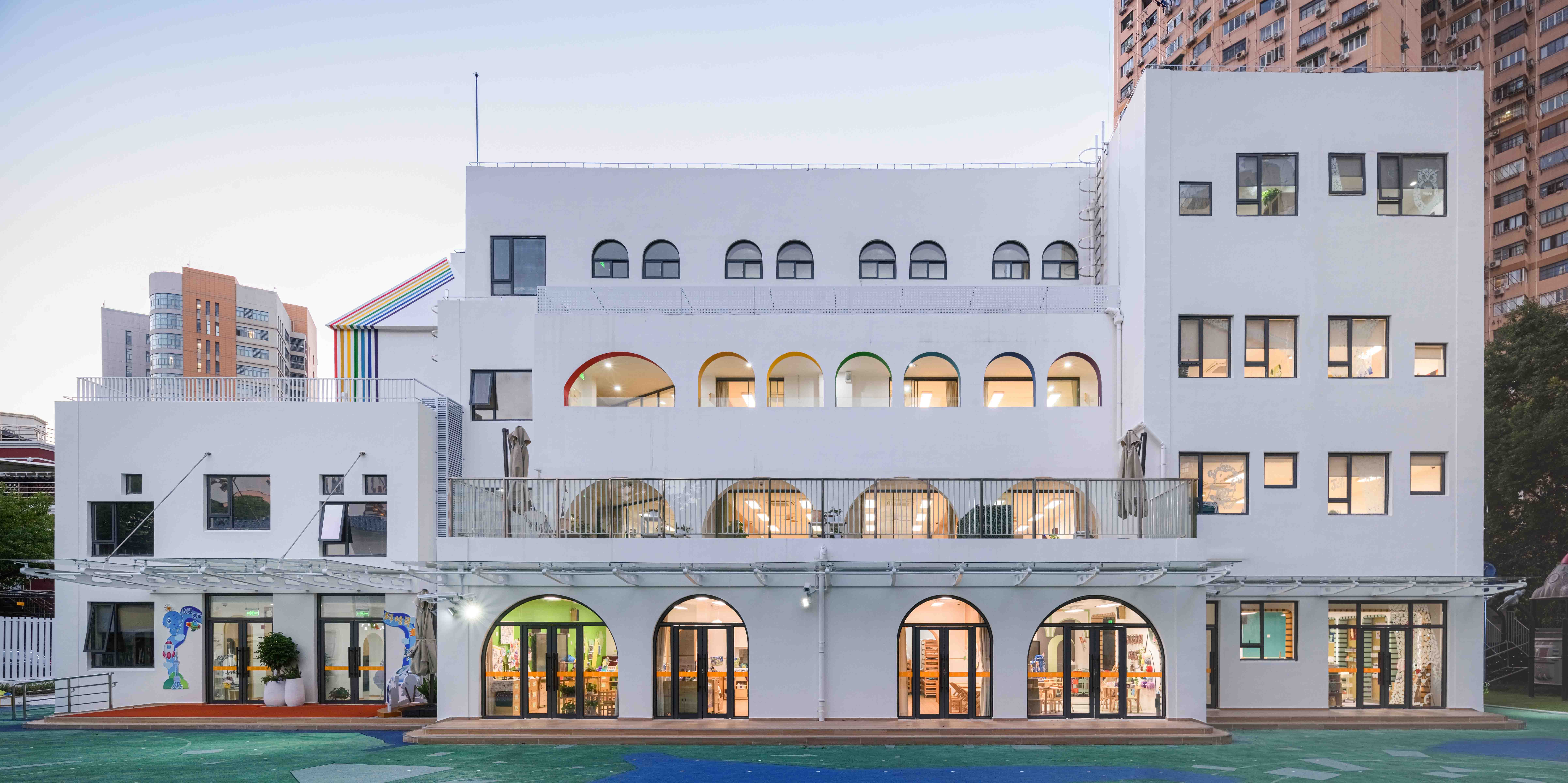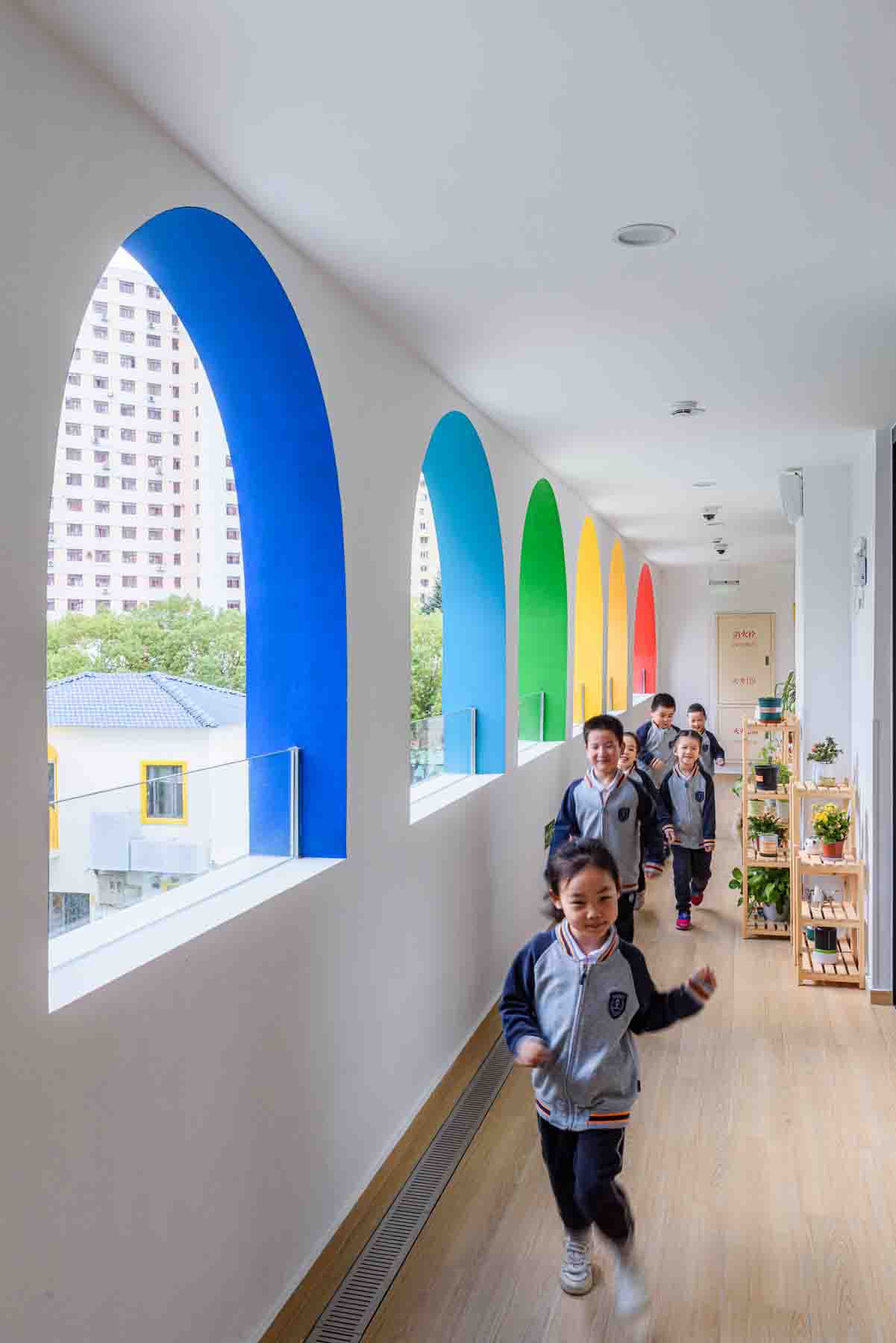 Design task is the replanning of the circulation, the façade and the space. The corridor is proximal and can not be connected with the south side of the activity site. The logistics circulation and the classroom circulation cross in the narrow proximal corridor. This leads to the problem of the children’s movement being blocked and the logistics personnel gathering. A corridor is divided in the middle of the classroom at the end of the corridor to the outdoor activity site. The inner corridor and the outdoor activity site form a closed circular circulation. The design change not only makes the inner corridor clear, but also makes the children have the motivation to run.The original north corridor is changed into the south corridor, and the toilet is moved to the original north corridor, which solves the problem of direct ventilation and lighting in the toilet. The corridor not only has daylighting, but also has an ambiguous transition space between outdoor activity platform and indoor space. The classroom has the tension of natural extension to the outdoor, creating more outdoor activities for children.
